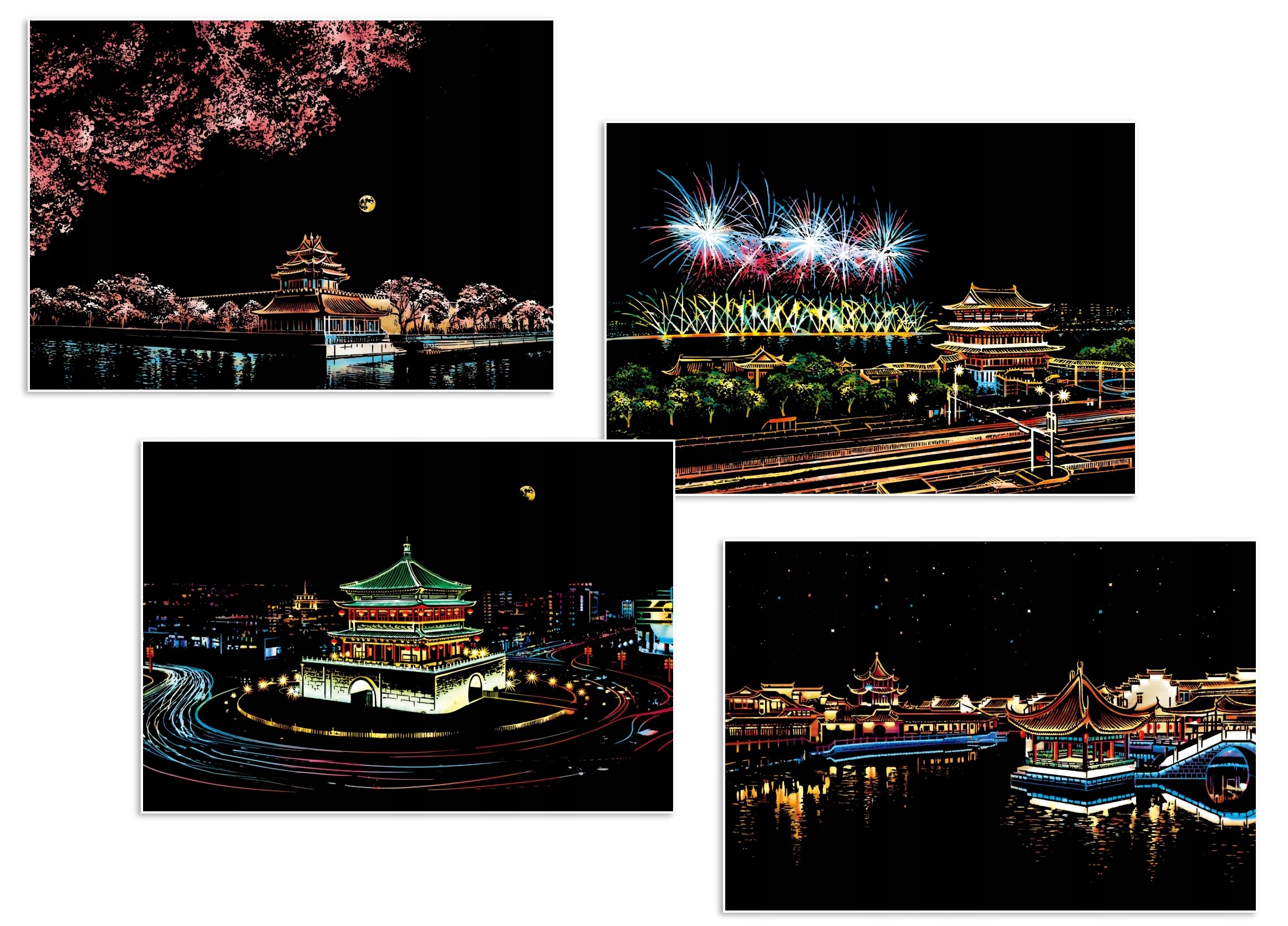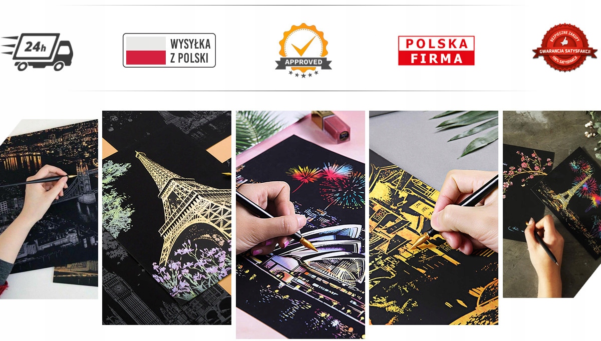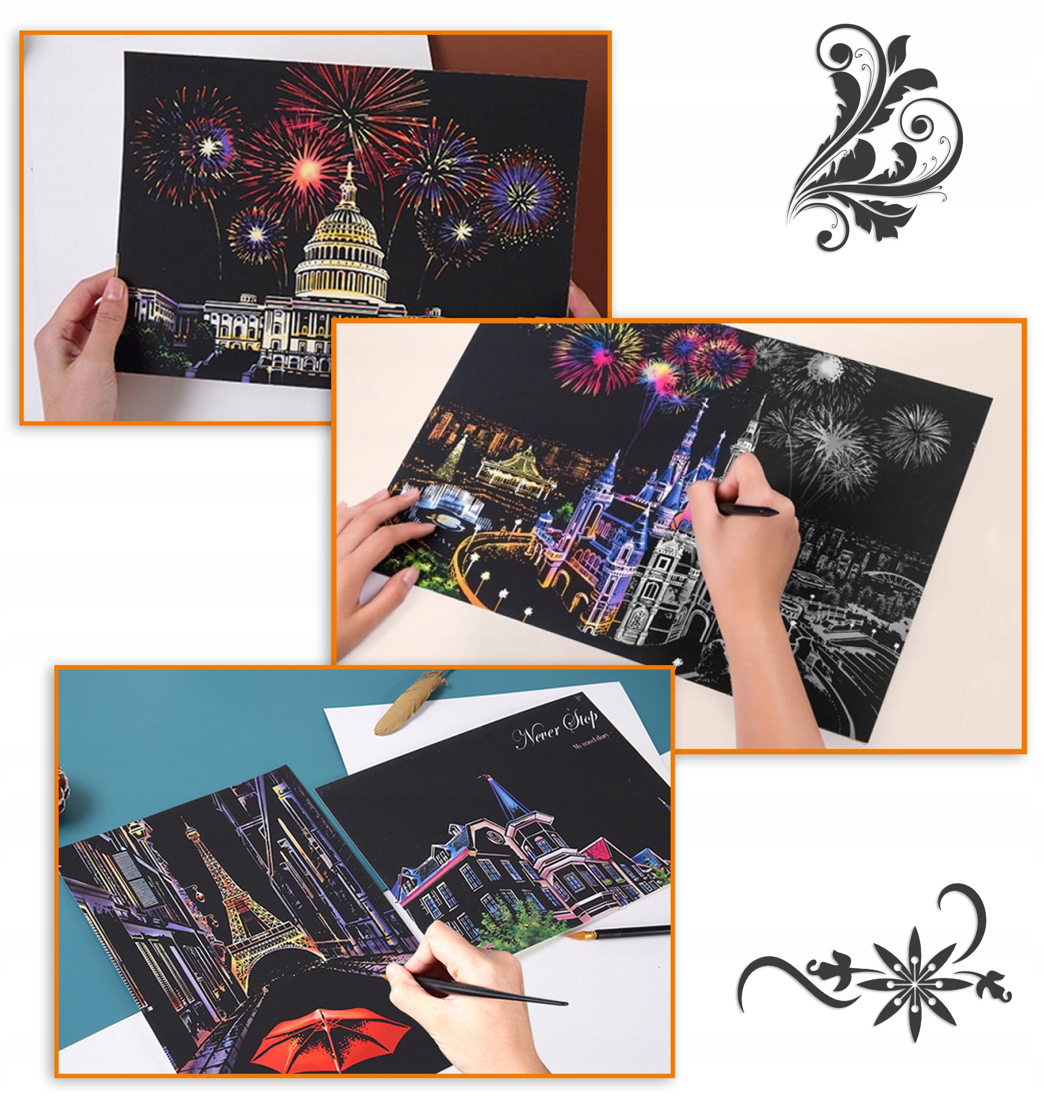 Черные скретч-карты имеют под собой креативные изображения для скретчинга. Картины красочны, богаты деталями, требуют точности и являются прекрасным украшением интерьера любого дома.