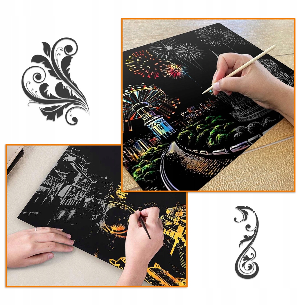 Скретч-рисование — это черные листы, покрывающие красивые красочные изображения, которые можно поцарапать. Игра предполагает стирание верхнего слоя черной краски специальным стилусом в отмеченных местах на листах – что позволяет постепенно выявить красивый, скрытый рисунок. Это очень весело для всех.