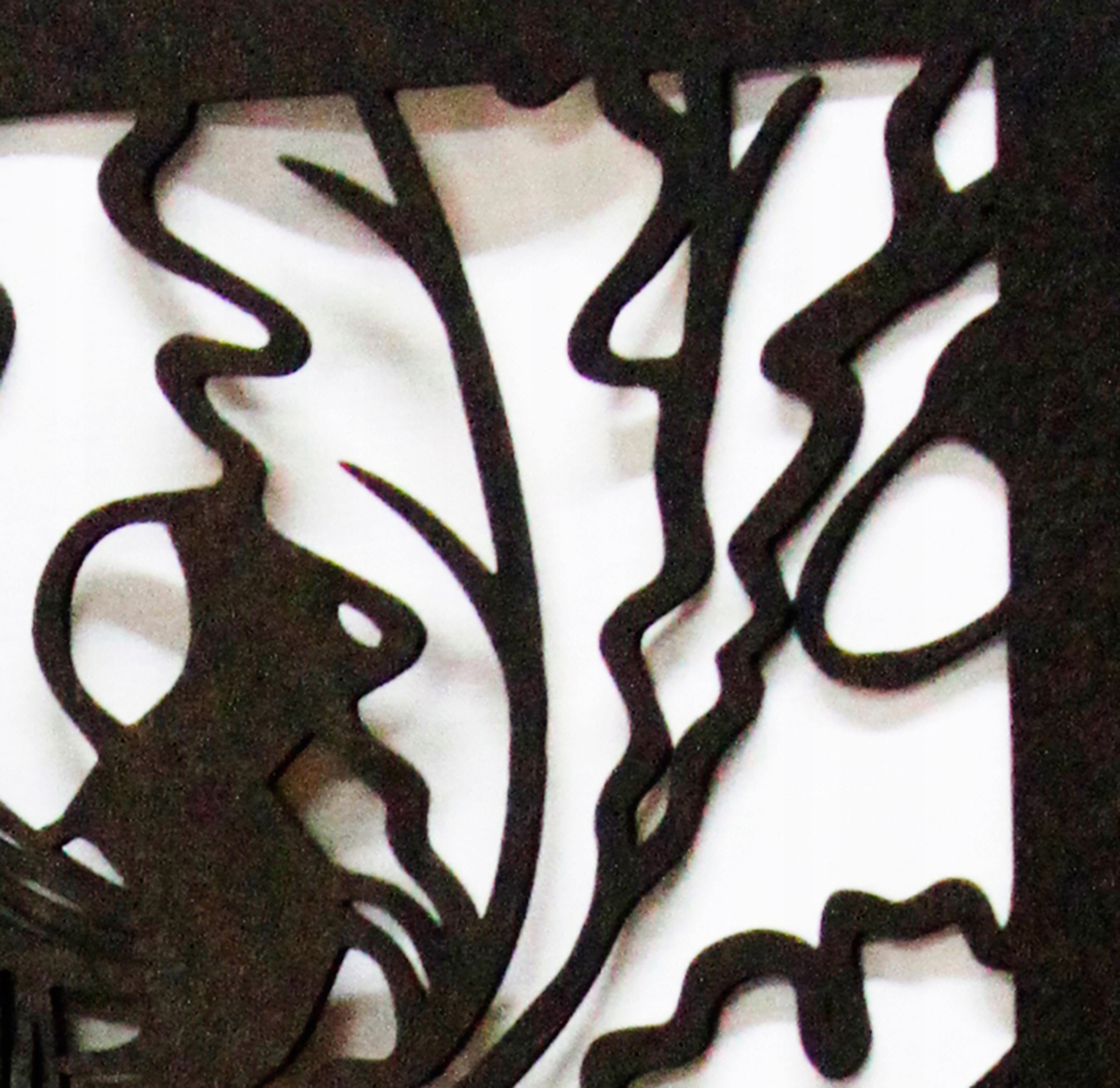 Изображение вырезано из плиты HDF. Картина односторонняя, окрашена в черный цвет итальянским акриловым лаком и заламинирована.