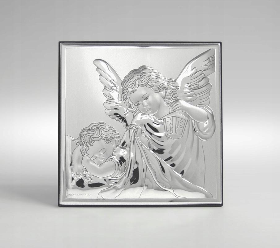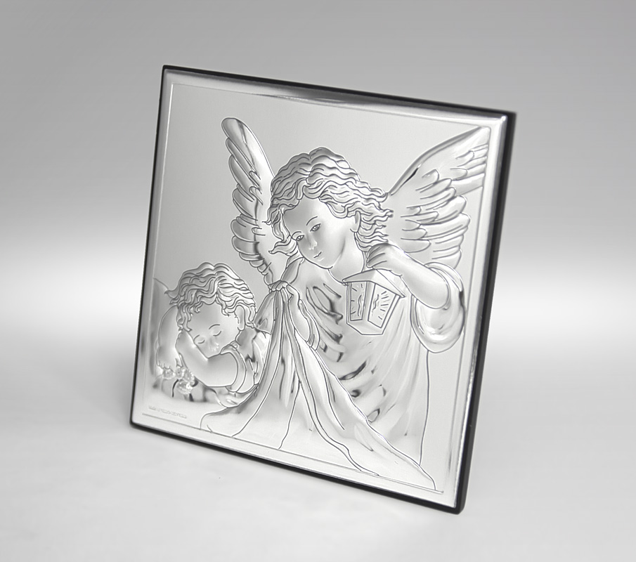 Серебряная картинка на крещение с изображением ангела с фонарем, склонившегося над спящим ребенком.