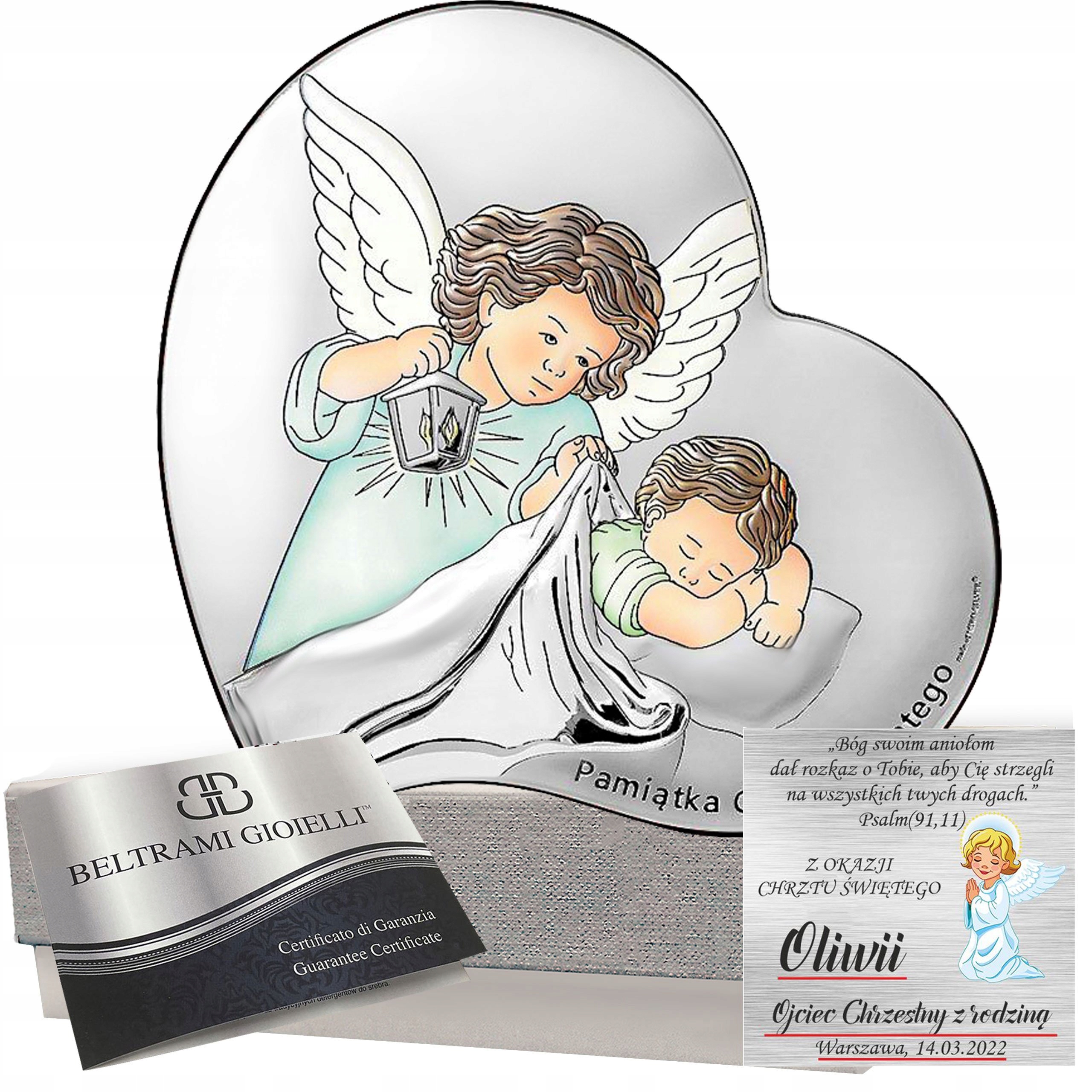Священные изображения являются важным элементом нашего предложения, поэтому мы рекомендуем вам подробно ознакомиться с предлагаемым ассортиментом, в том числе с серебряными святыми образами с посвящениями. Они прекрасно символизируют семейные ценности, которые чрезвычайно важны для каждого из нас. Представляем незабываемый подарок на крестины. Изысканная картина с изображением Ангела-Хранителя с личным посвящением запечатлит то, что мимолетно: радость этого особенного дня для всей семьи - Святого Крещения. Картина с изображением Ангела-Хранителя.Прекрасный подарок ко Святому Крещению! Безусловно незаменимыйКрещенский сувенир, подарок на Святое Крещение, символизирующий волшебную заботуАнгела-Хранителя.