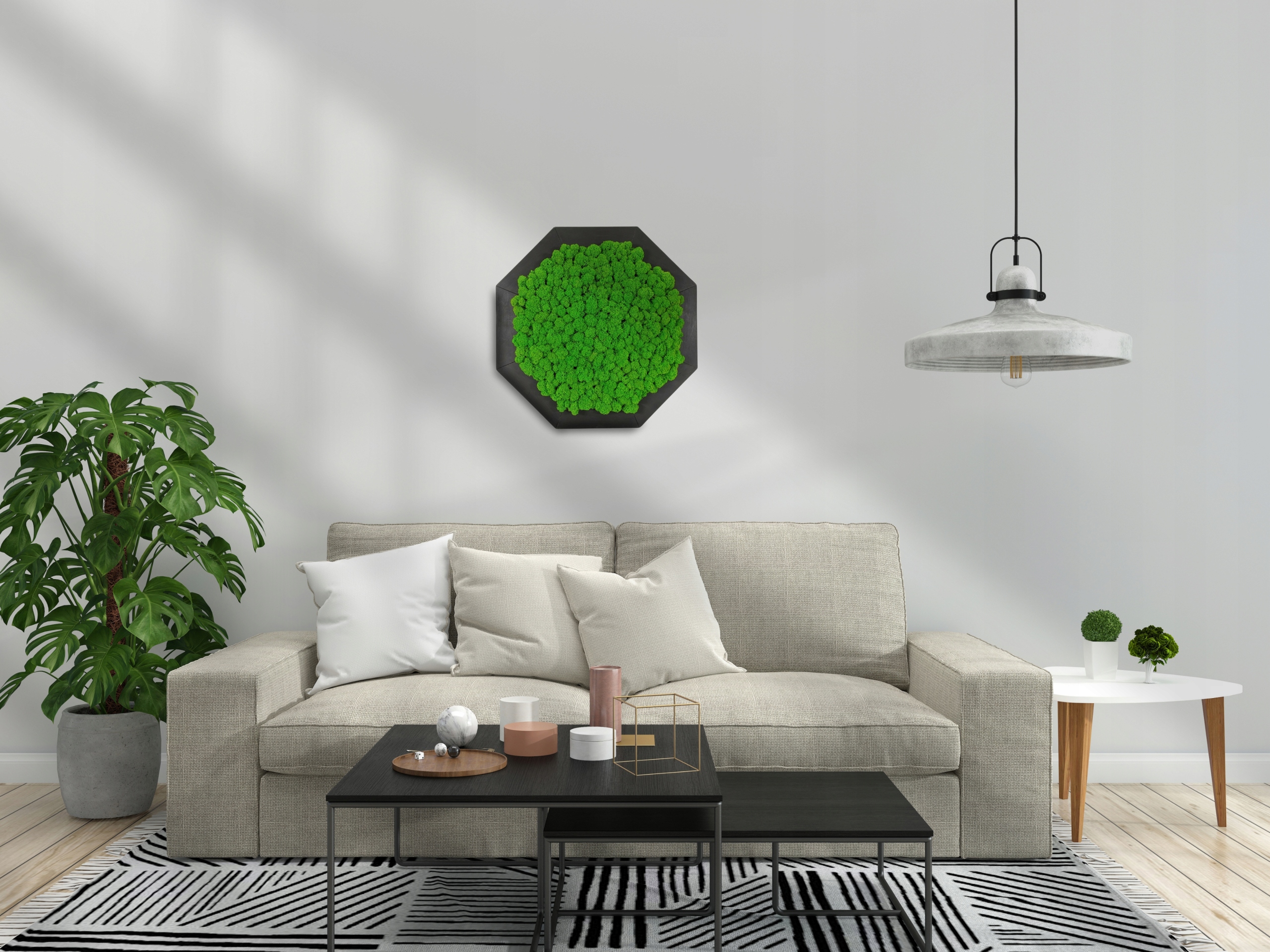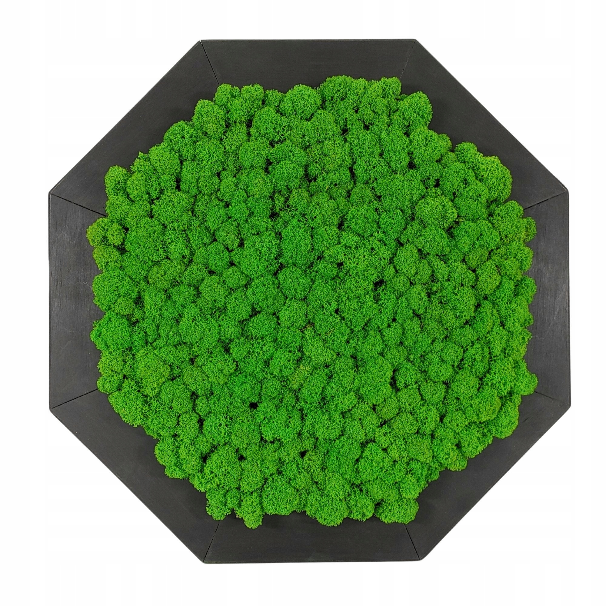 Изображение от легкой царапины помещали в впечатляющую черную деревянную деревянную раму в виде восьмиугольника b> с размерами 36x36 сантиметров. Энергичный, легкий цвет цвета смелого контрастирует с цветом кадра , создавая ненаблюдающую композицию, из которой трудно оторвать глаза. тщательно отобранные пучки смелых, постоянно помещенных в кадр. Они плотно прилипают друг к другу, создавая мягкую, эластичную поверхность. Отдельные головки лишайника имеют другую высоту и слегка различаются по цвету, что добавляет композицию эстетических значений.