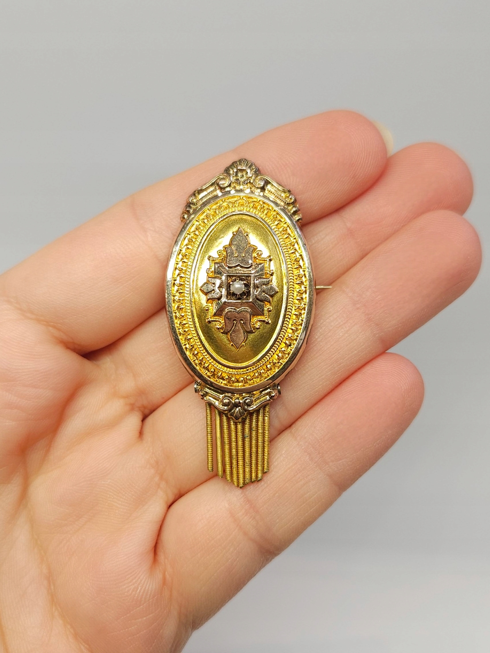 овальный, золотой бруш со второй половины Xixw., Украшенная небольшой полупроверенной и формой движущихся «полос», также сделанной из позолоченной латуни; Из -за возраста видимые ссадины позолота по бокам