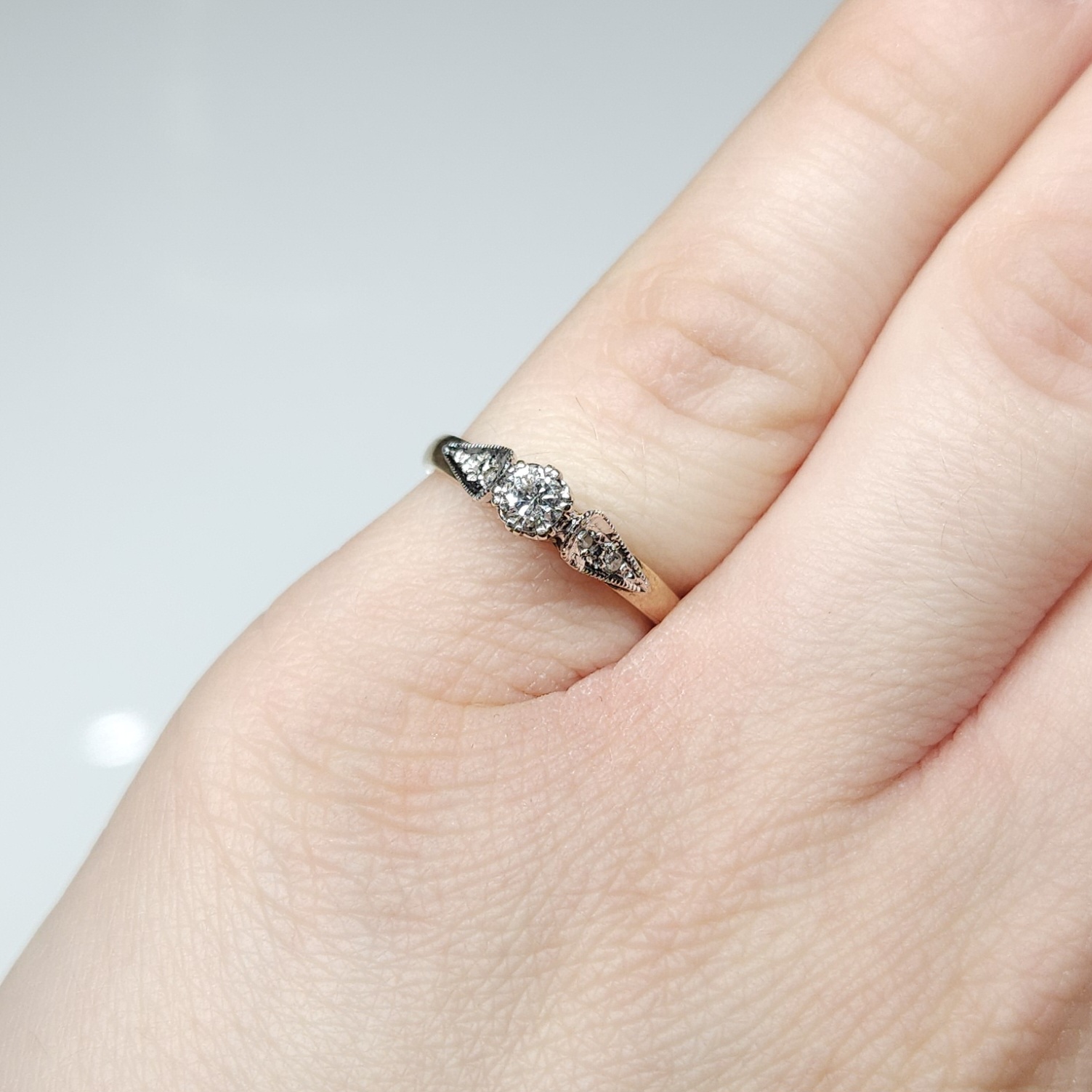 Кольцо из желтого и белого золота, украшенное бриллиантами в рельефной оправе; центральный камень: 1 шт. весом ~0,20 карата и 4 шт. общий вес ~0,025ct
