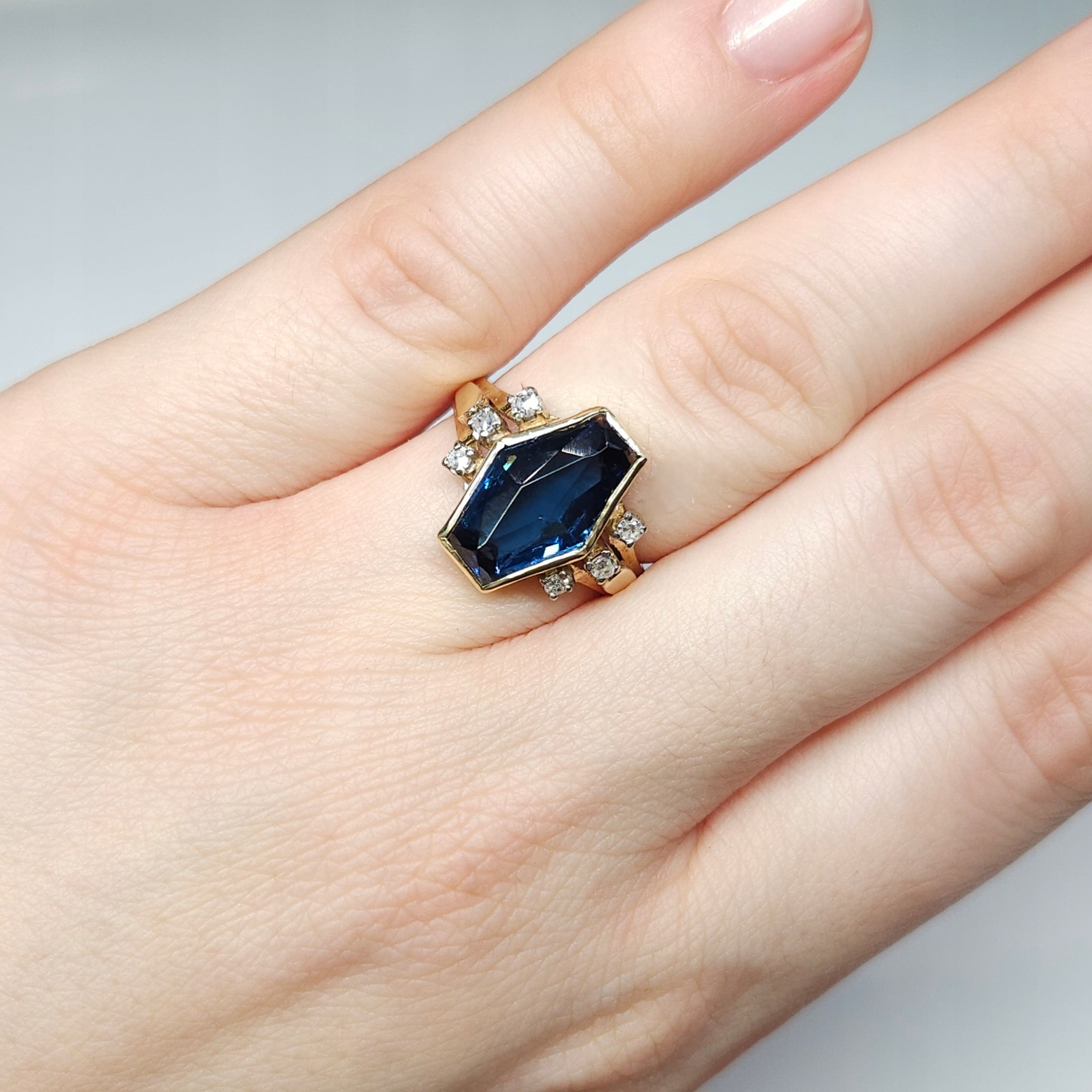Золотое кольцо с темно-синим камнем - имитацией сапфира и бриллиантами старой огранки - 6 шт. общим весом ~0,18 карата