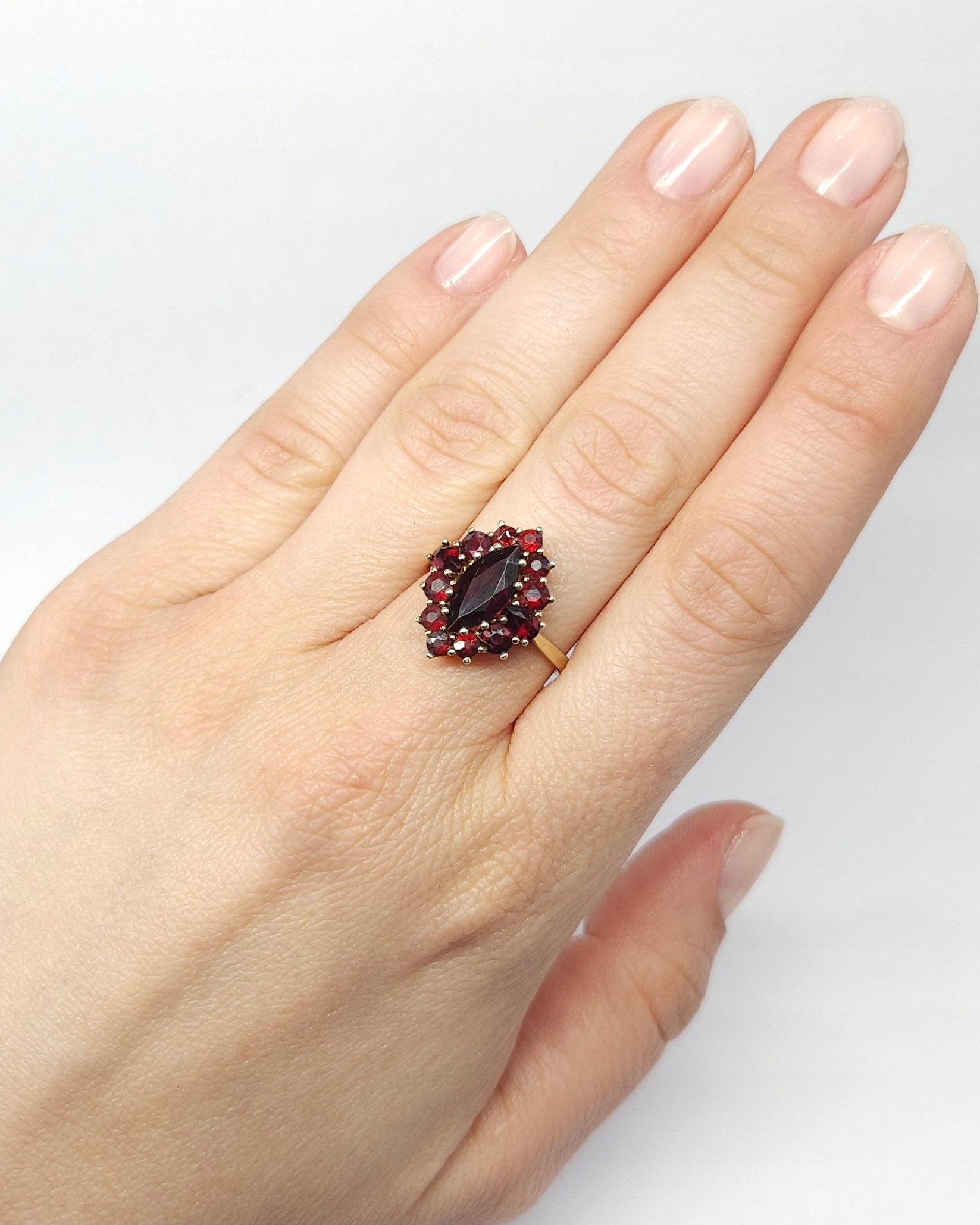 Золотое кольцо с гранеными гранатами – крупнее, в центре, в окружении камней меньшего размера; Ввиду возраста на одном из камней имеется небольшой скол.