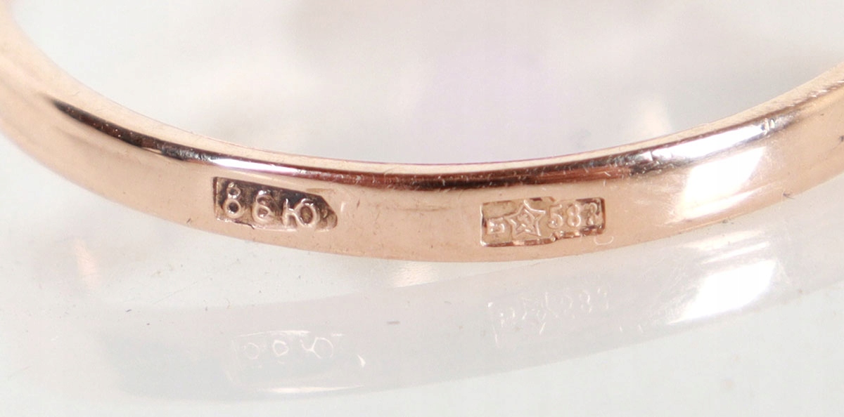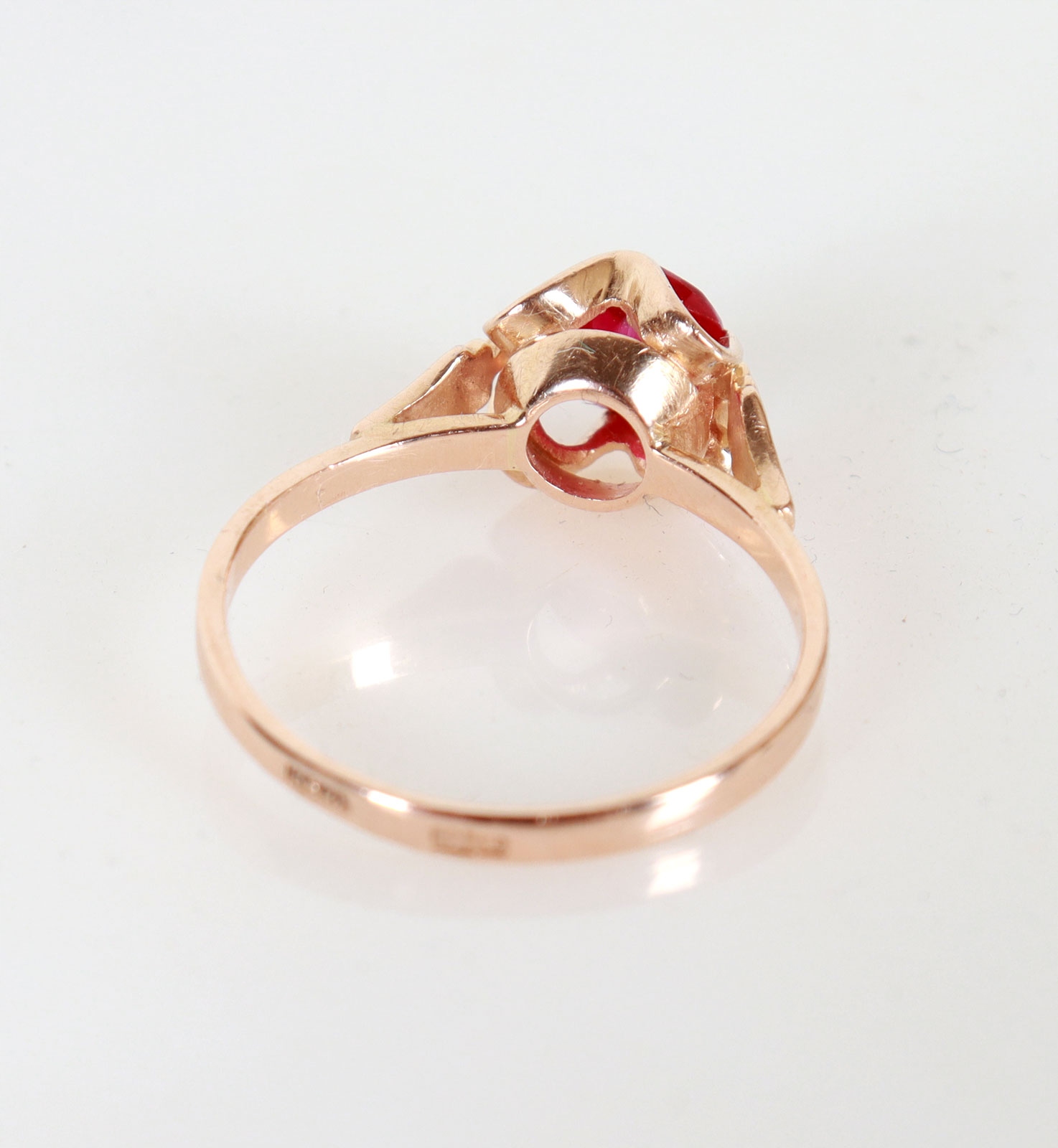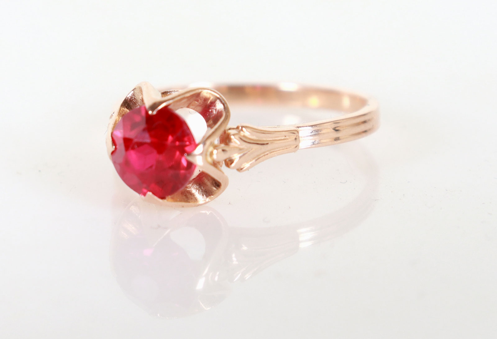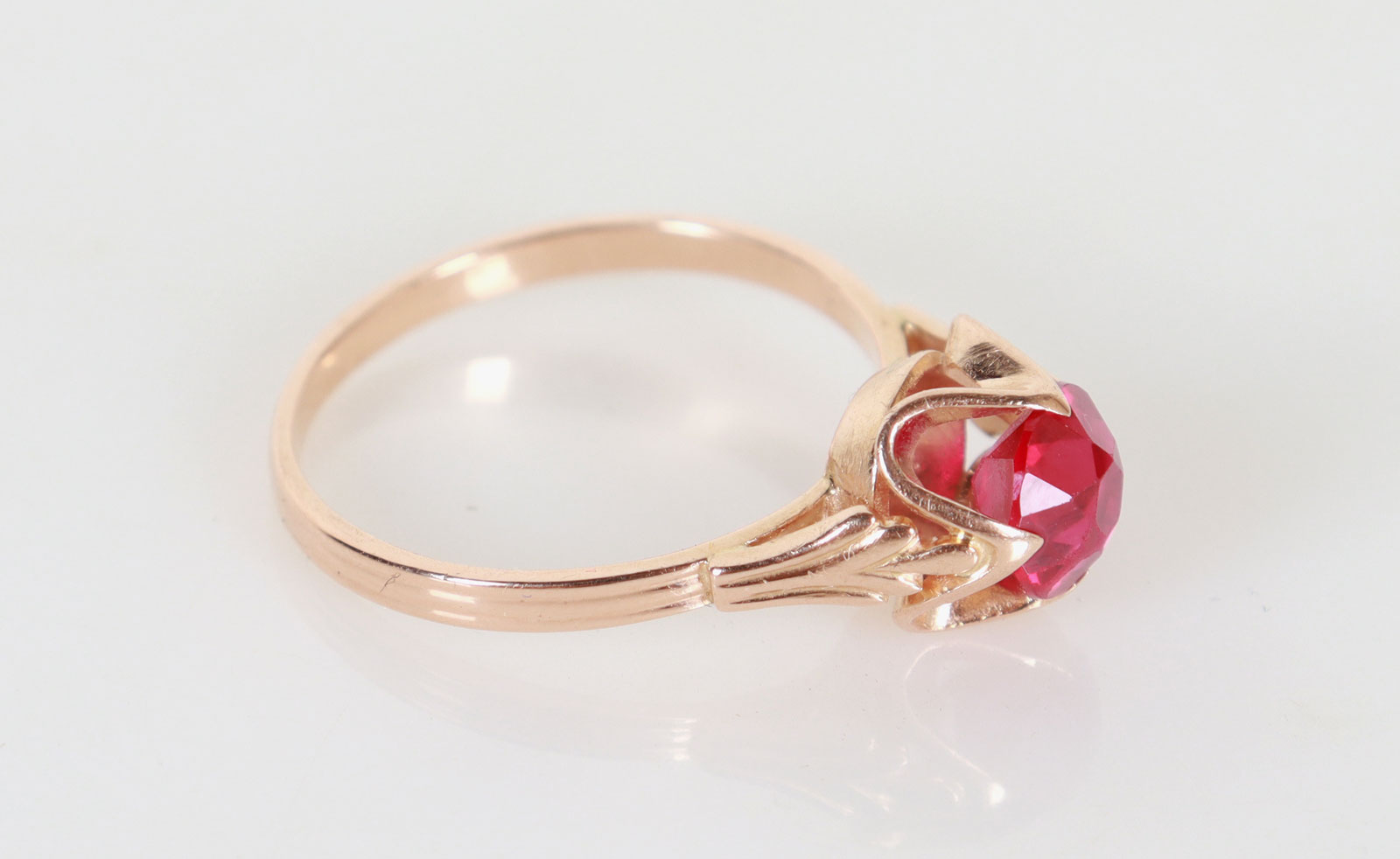 Кольцо из золота 14К (0,583). Корона украшена рубином граненой огранки (старый синтез).