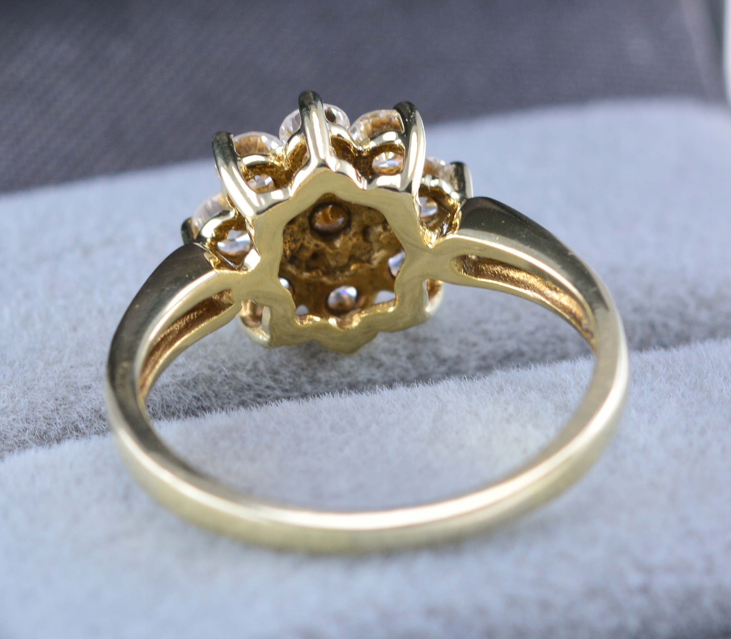 Предмет продажи – очаровательное и нежное золотое кольцо с бриллианты общим весом 0,66 карат и параметрами: чистота Vs-Si, цвет H-I. Коронка кольца в виде цветка, диаметр 10 мм.