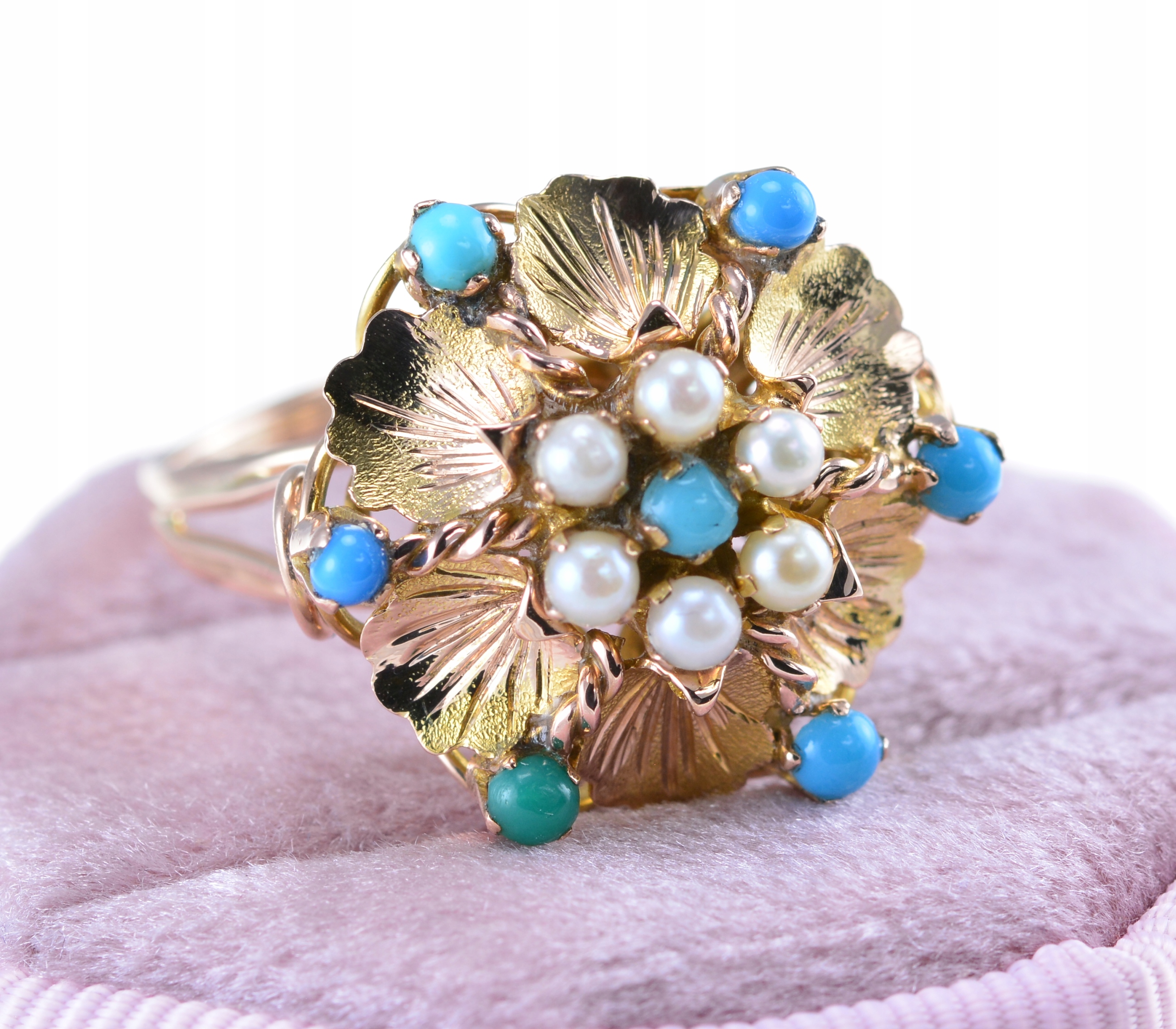Предмет продажи – великолепное золотое кольцо, украшенное натуральной бирюзой и жемчугом. Коронка в виде цветка, диаметр 20 мм.