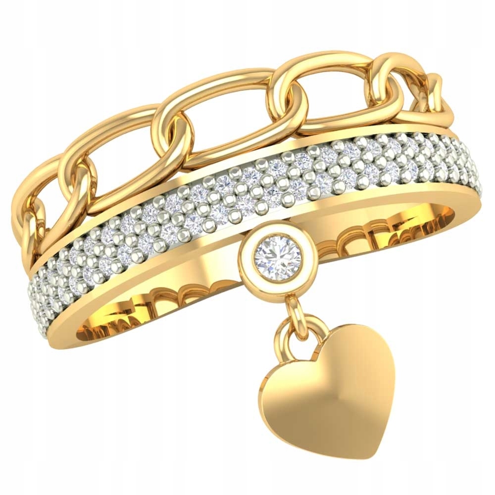 Элегантное оригинальное кольцо, украшенное подвижной подвеской в форме сердца. Верхняя часть кольца состоит из соединенных друг с другом звеньев, под ними расположен ряд многочисленных красиво сверкающих цирконов. Он полностью изготовлен из желтого 14-каратного золота 585 пробы.