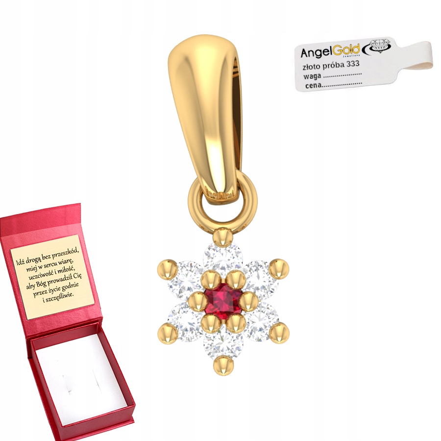 Нежный кулон в форме цветка — это предложение, сочетающее в себе классическую красоту и современную отделку. Подвеска, полностью выполненная из желтого 8-каратного золота (333 пробы), привлекает внимание своим мастерством исполнения и деталями. Его очарование подчеркивают блестящие цирконы и синтетический рубин, расположенный в центре, что придает всему кулону неповторимый характер.