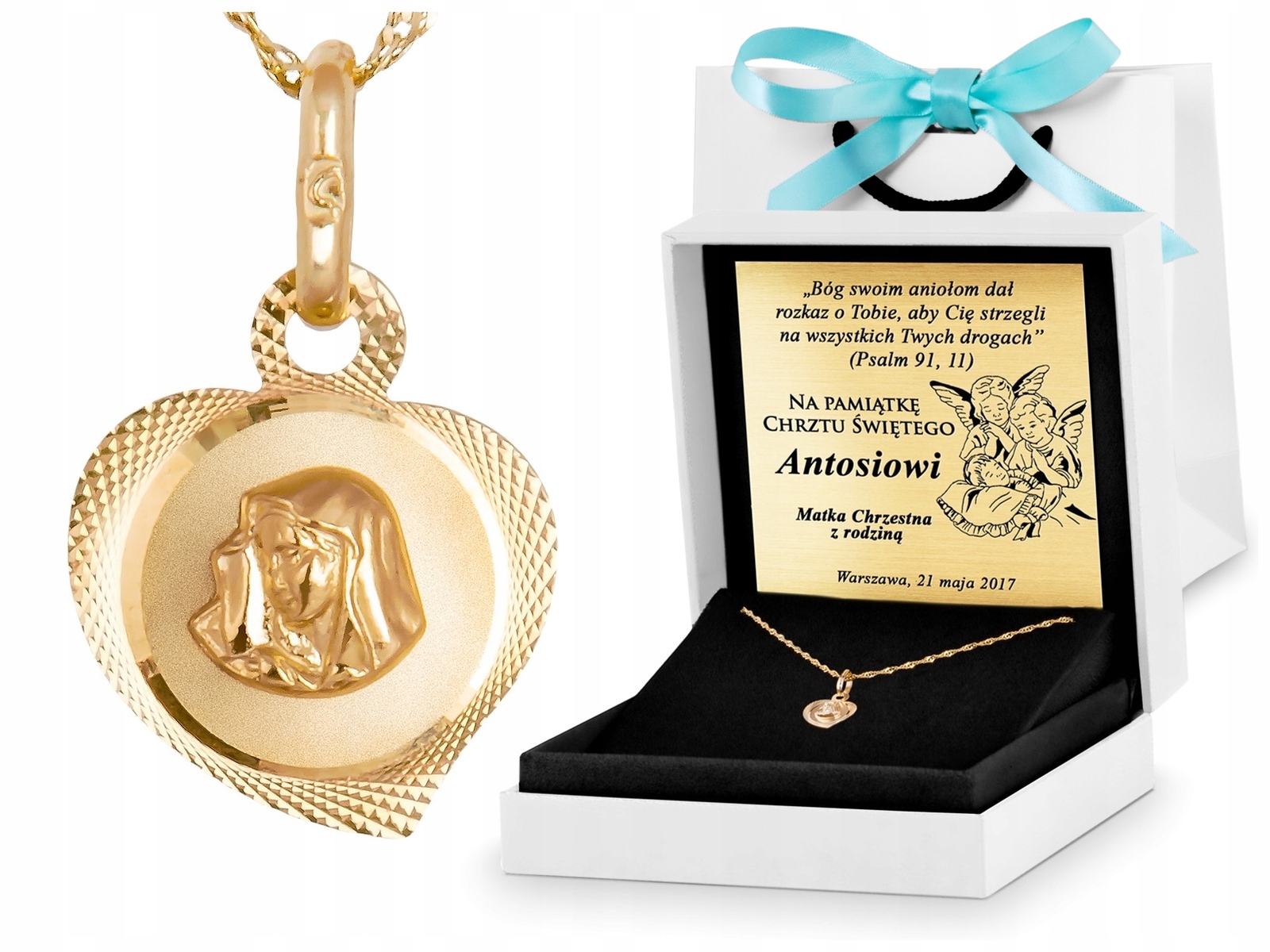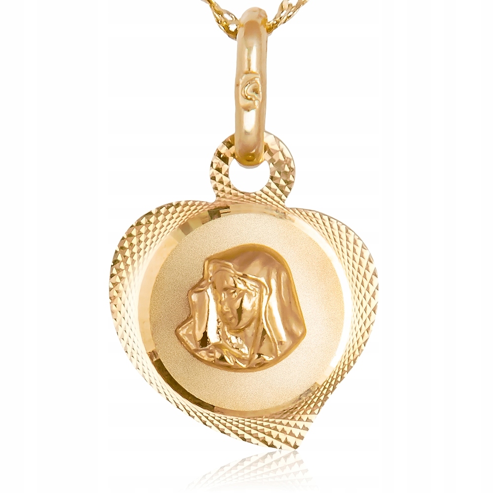 Основа композиции, состоящей из цепочки и кулона, — изысканное переплетение с витой структурой. Каждое звено соединено чрезвычайно точным и прочным способом, что гарантирует высокую устойчивость к разрыву, а также является доказательством ювелирного мастерства, характеризующего изделие. Цепочка дополнена застежкой-карабином, что упрощает повседневное использование. На цепочке подвешен медальон в форме сердца, края которого декорированы в технике алмазной, образующей четкий геометрический узор. Фигура Богородицы помещена на полированную, гладкую поверхность, благодаря чему силуэт приобретает выпуклое, характерное выражение. Все это сделано из золота 585 пробы. Об этом свидетельствуют прилагаемые ювелирные бирки и пробина металла, отштампованная непосредственно на изделии. Набор станет вечным подарком любимому человеку, а в сочетании с гравировкой-посвящением выразит сердечные пожелания и нежную симпатию.