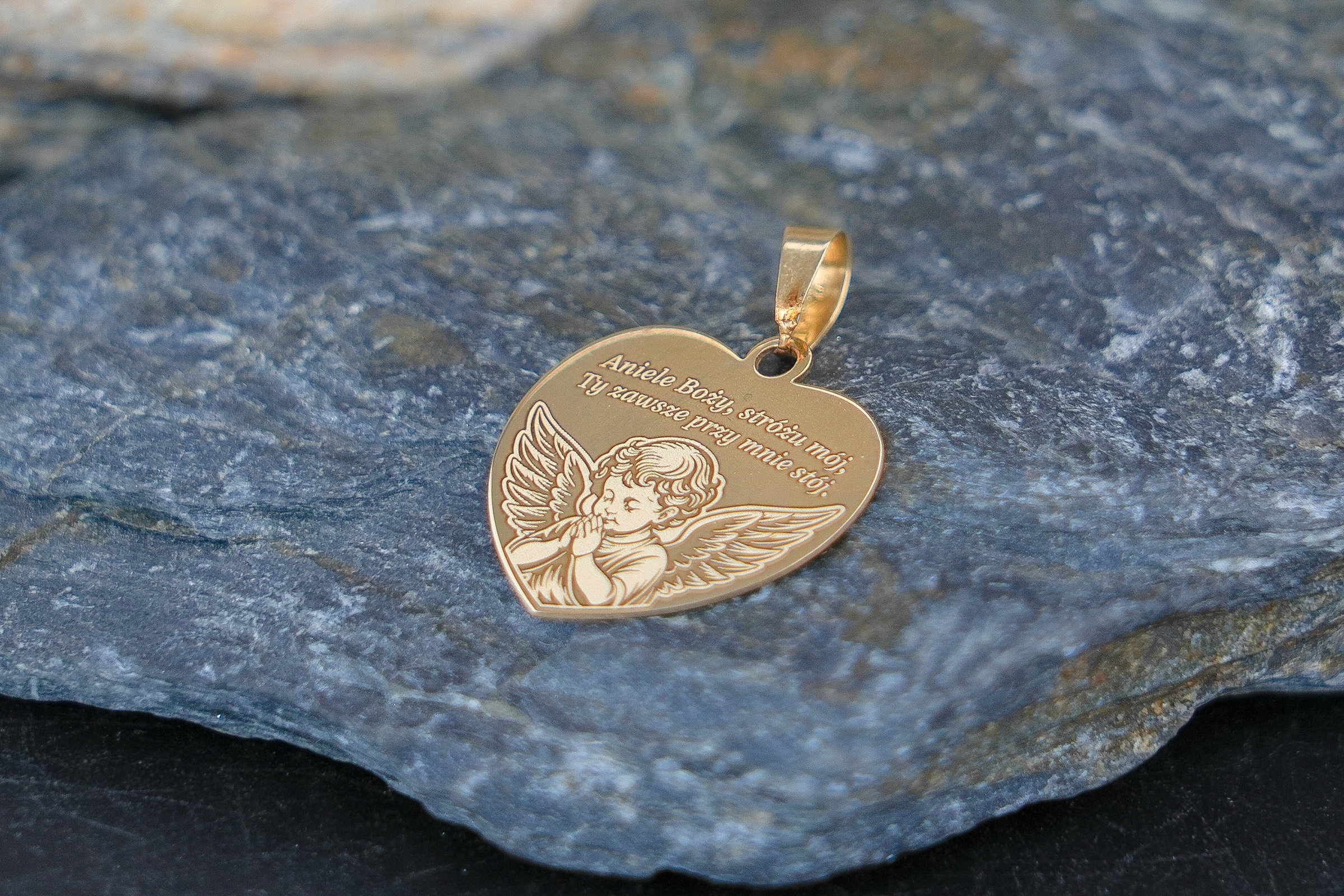 Золотой кулон с ангелом и молитвой "Aniele God". Стаивание крещения или причастия