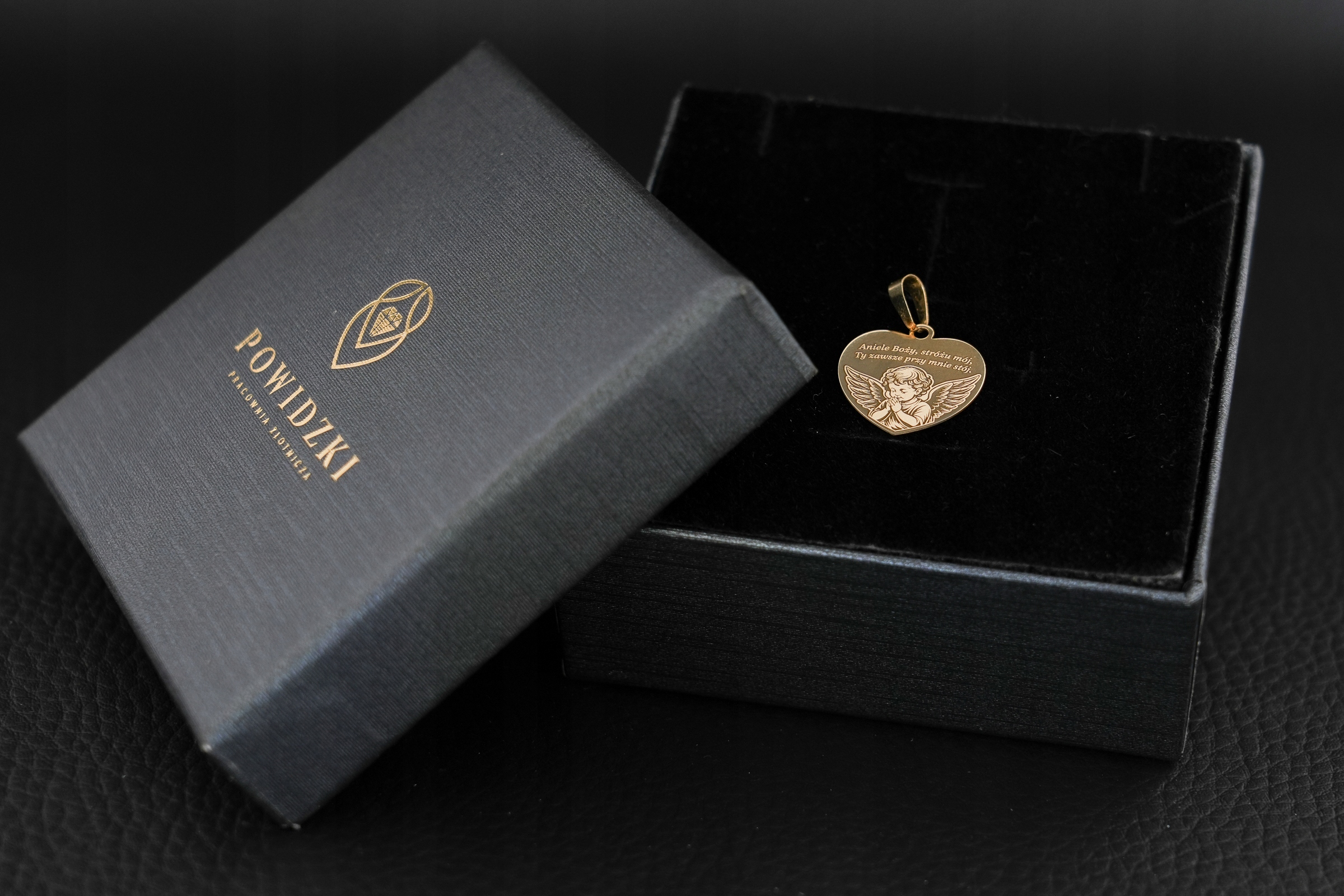Красивый золотой кулон в форме сердца, сделанный из золота высочайшего качества 585 . На его поверхности существует нежная гравюра, изображающая моляющего ангела , и над ней выгравированная молитва: