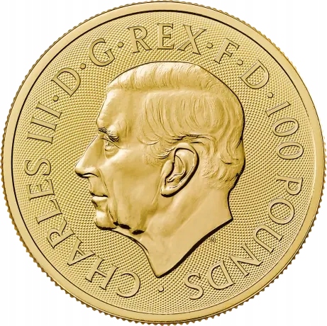 представляет портрет нынешнего короля Англии, Чарльз III, который, в отличие от своей матери, королевы Елизаветы II, смотрит вправо. Вокруг его портрета есть надпись «Карл III. D G Rex F D» вместе с деноминацией монеты «100 фунтов». Письма «D G Rex F D» являются аббревиатурой латинского «Dei Gratia Rex Fidei Defender». На немецком языке эти сокращения превращаются в «Царь Божьей благодати, защитника веры».