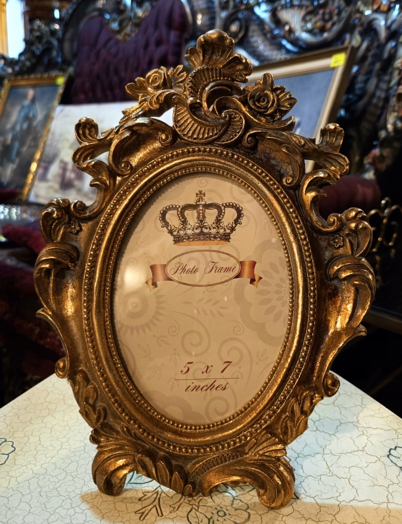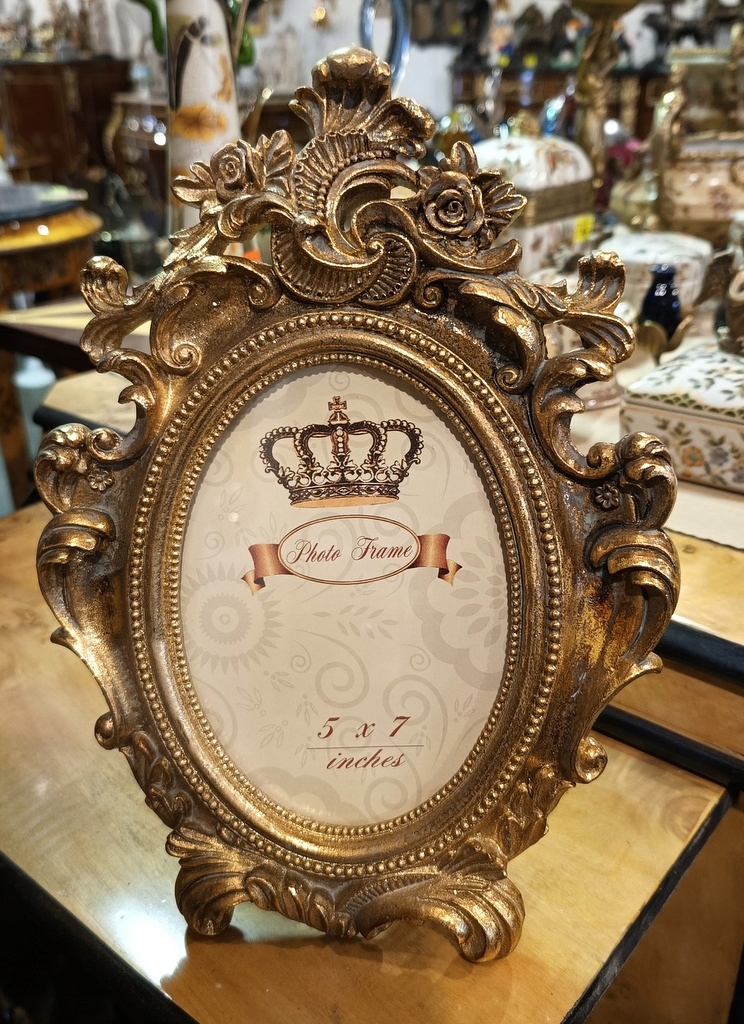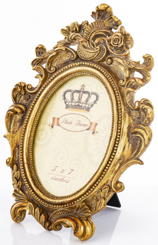 Привлекательная фоторамка. Современник из смолы золотистого цвета, украшенный чудесным декором. Благодаря чудесной форме размещенная в ней фотография выглядит элегантно, и вся эта вещь непременно станет украшением вашего дома или отличным подарком на случай. Каркас оснащен опорой сзади.
