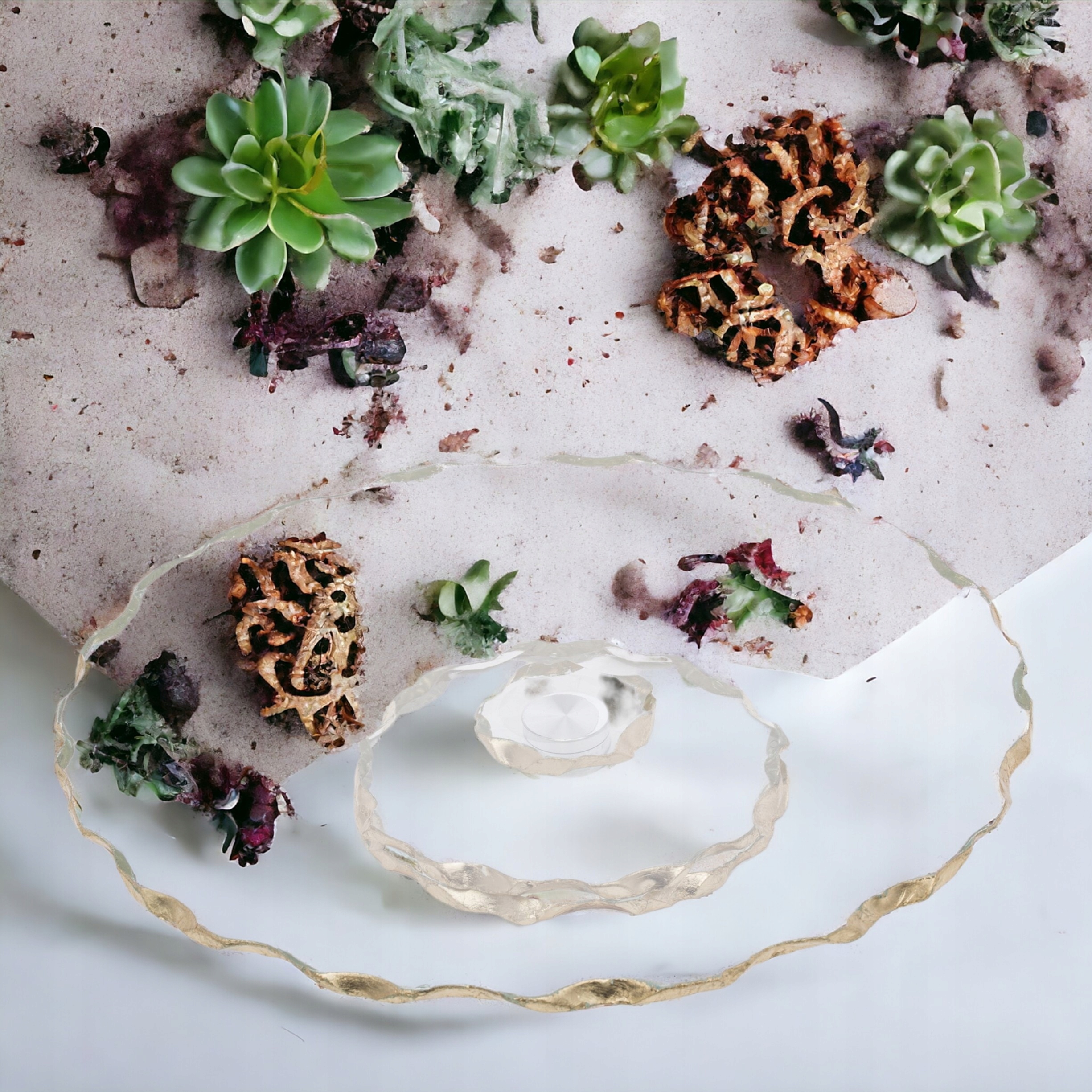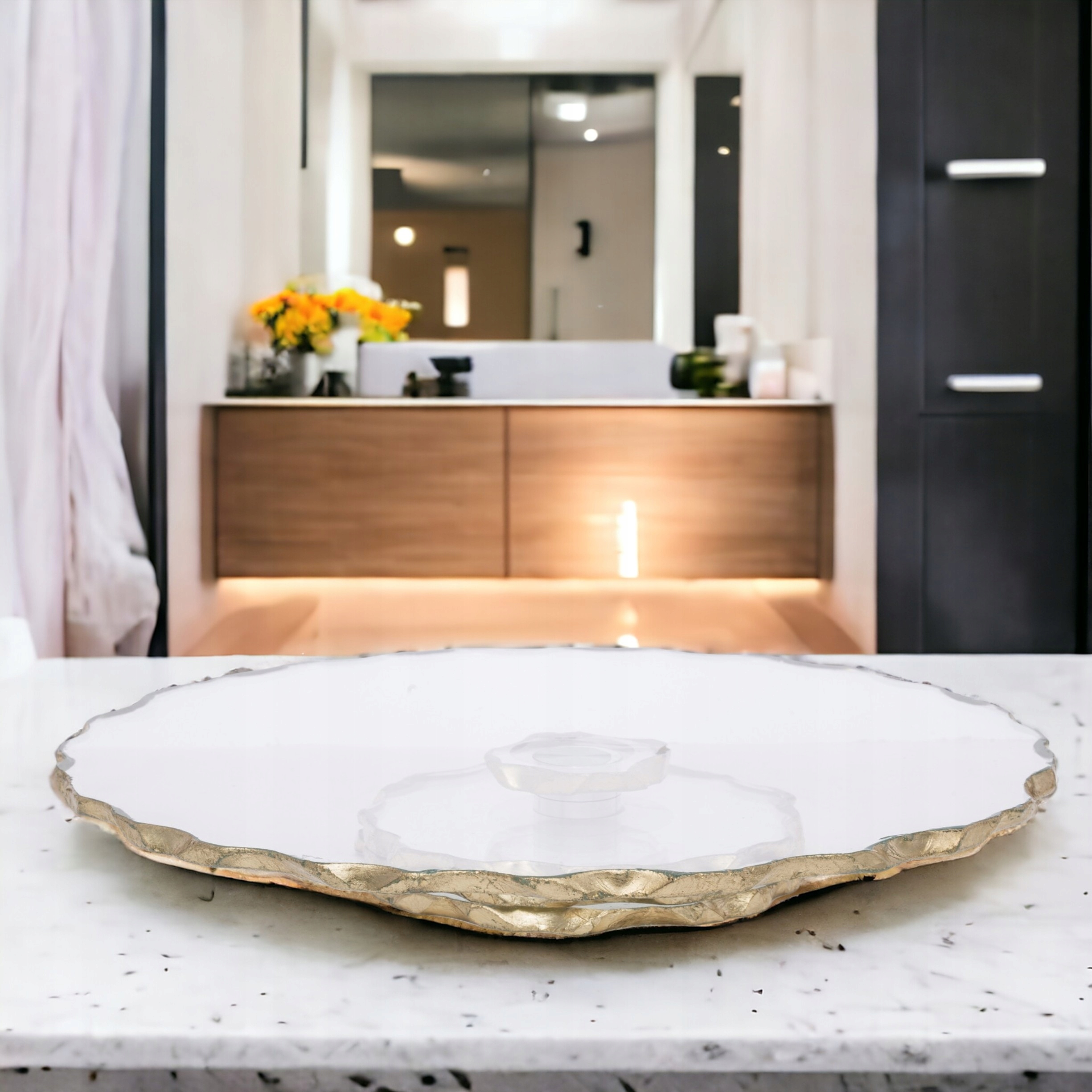 Современная ротари -патера с неровными краями, оснащенными круглой ручкой. Установленный из стекла и декоративного золота создает каменное влияние на края, добавляя весь эффект гламура.
