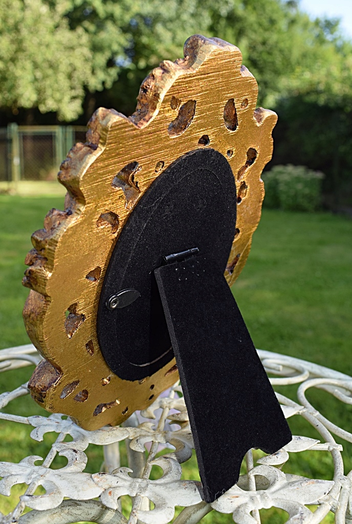 Привлекательная фоторамка. Изготовлен из смолы золотистого цвета. Благодаря чудесной форме размещенная в ней фотография выглядит изысканно, и вся эта вещь непременно станет украшением вашего дома или отличным подарком на случай.