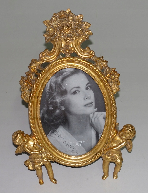 Стильная, привлекательная фоторамка. Изготовлен из старой смолы цвета золота, украшен чудесным декором, особенно в короне, и весь поддерживается двумя амурами. Благодаря чудесной форме размещенная в ней фотография выглядит элегантно, и вся эта вещь непременно станет украшением вашего дома или отличным подарком на случай. Каркас оснащен опорой сзади.