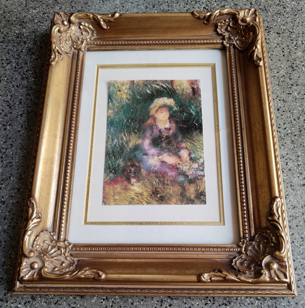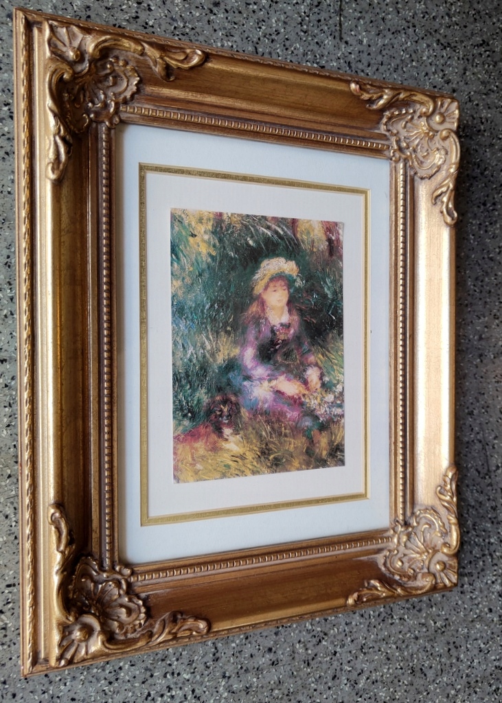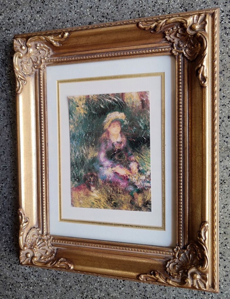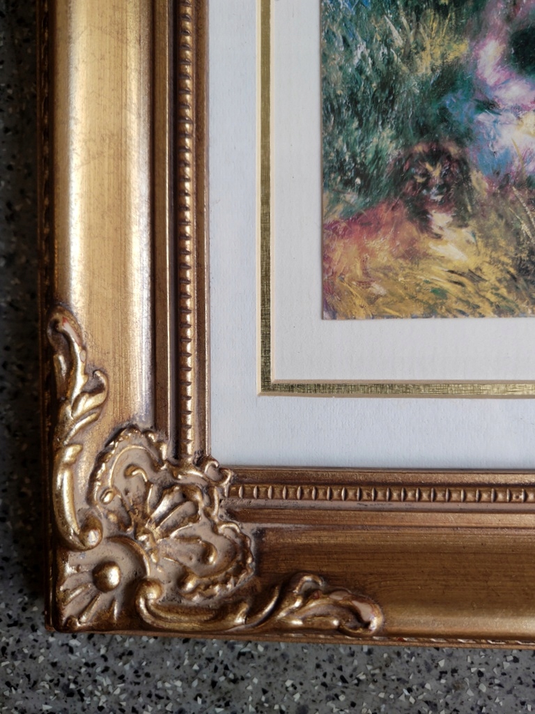 Картина б/у и в очень хорошем состоянии. Оформлена в стильную деревянную золотистую раму с паспарту и бордовой каймой; застекленный. Барокко, стильный декор по периметру и углам рамы.