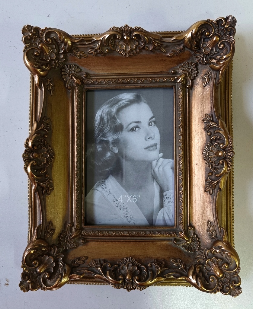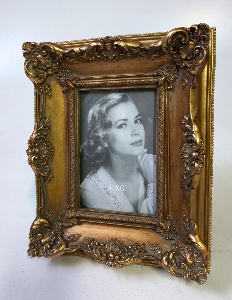 Привлекательная фоторамка. Современник из смолы золотистого цвета, украшенный чудесным декором. Благодаря чудесной форме размещенная в ней фотография выглядит элегантно, и вся эта вещь непременно станет украшением вашего дома или отличным подарком на случай. Рамка сзади оснащена опорой.