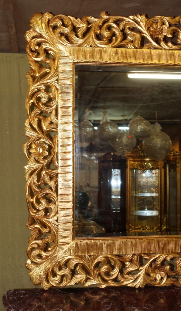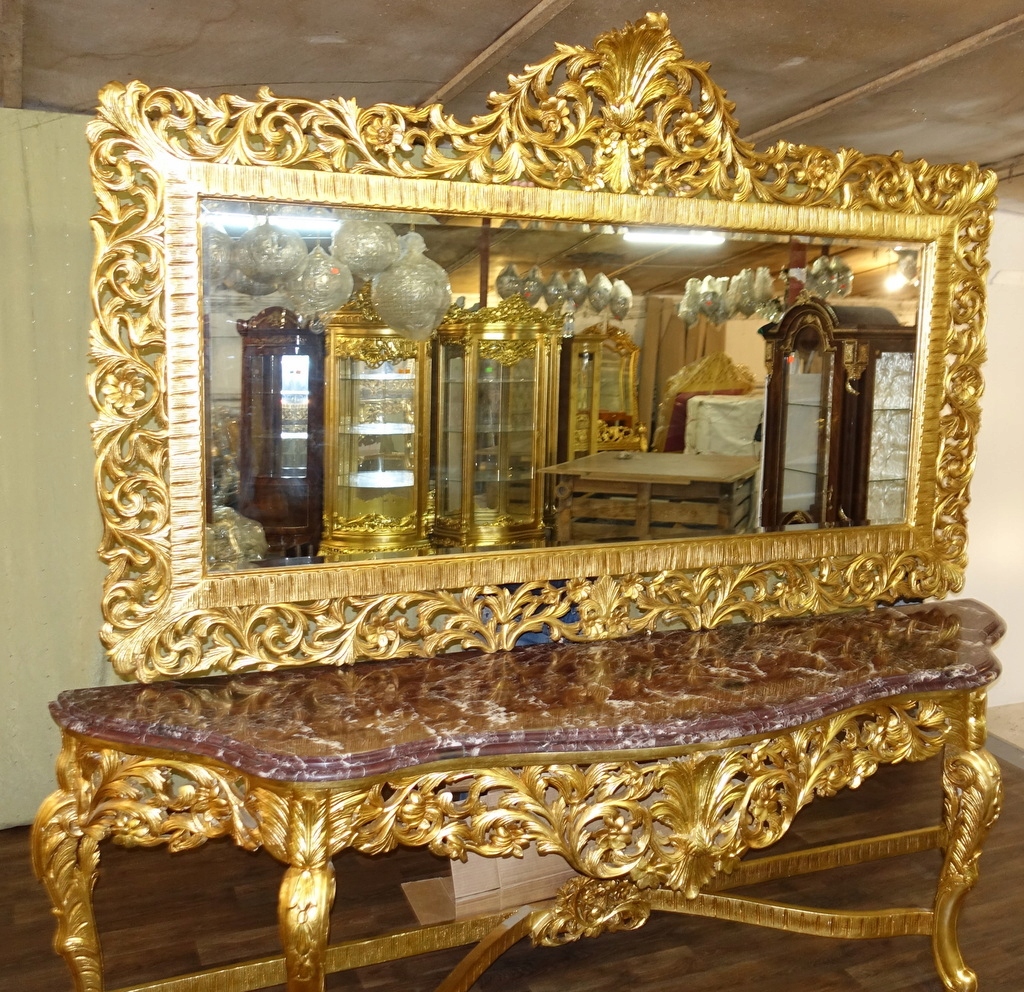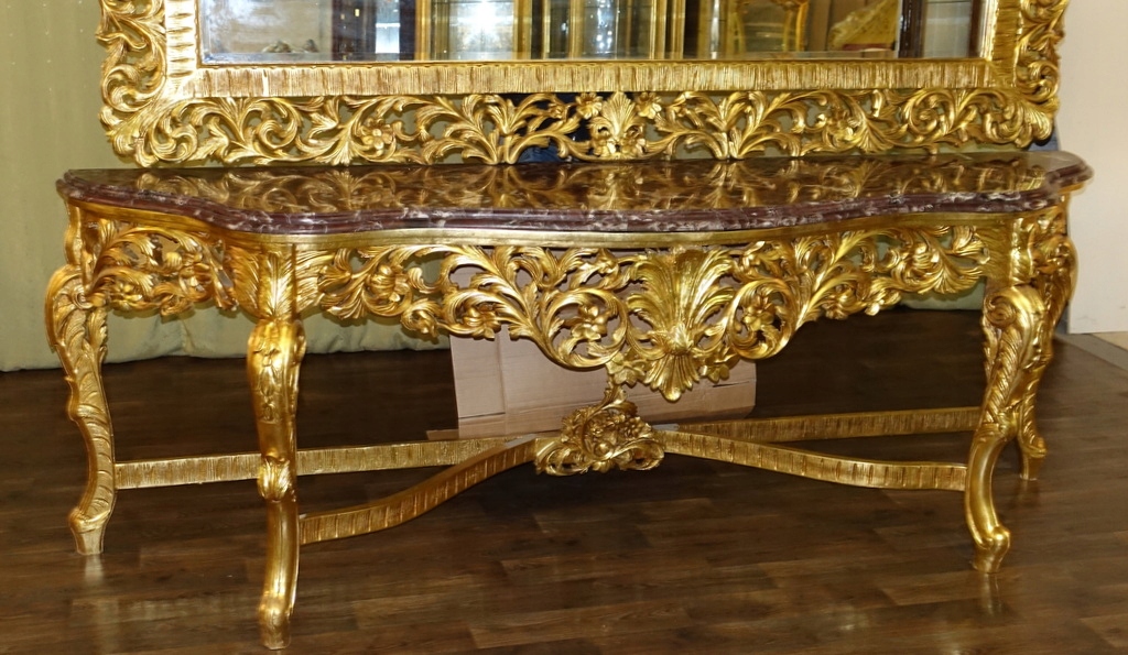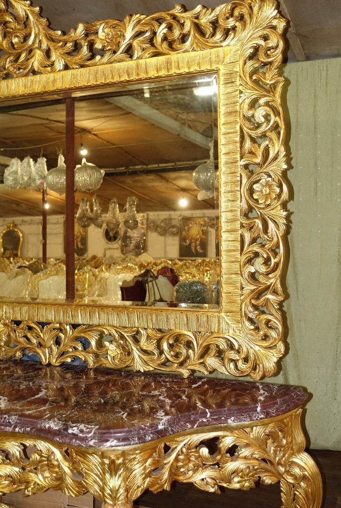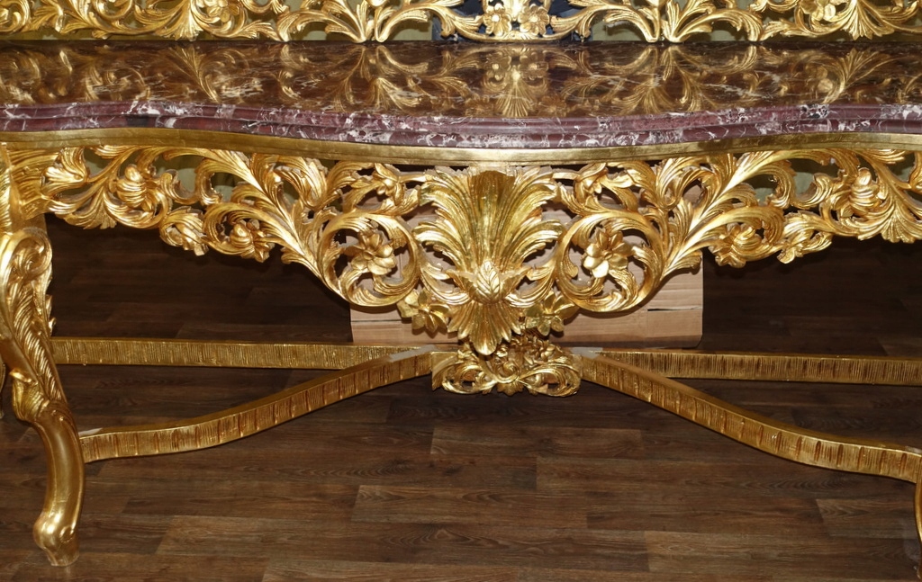 Предмет мебели восхищает своей уникальностью и качеством исполнения. Он новый, выполнен из дерева в стиле барокко. Зеркало с изящной ажурной скульптурой; особенно в короне. Мраморная столешница бордово-кирпичного цвета с фантастическими светлыми прожилками, установленная на столь же красивой резной консоли. Дерево цвета старого золота. Консоль стоит на четырех стильно изогнутых ножках. Все это создает неразрывную гармонию.