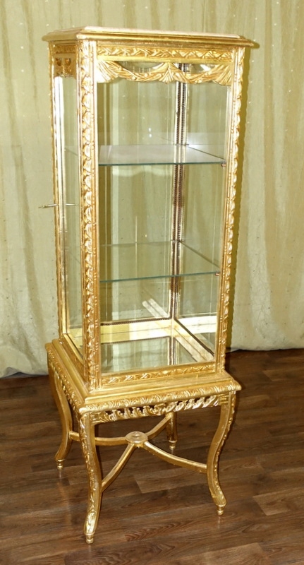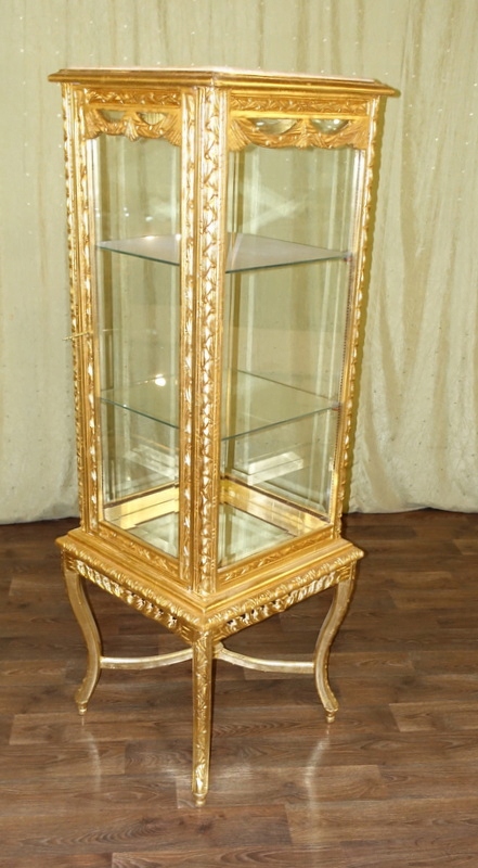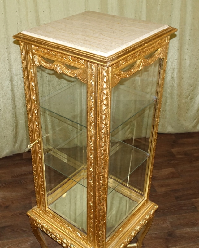 Этот предмет мебели выполнен в современном стиле, сохраняя при этом старый дизайн и стиль. Имеет две стеклянные полки. Он застеклен с каждой стороны скошенным стеклом и увенчан практичной мраморной столешницей песочного цвета. Прекрасные ажурные скульптуры, цвет дерева – старое золото, придающий витрине изящность и легкость на высоких ножках.
