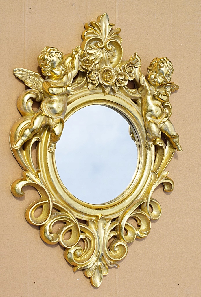 Красивое, эффектное зеркало с фантастическим ажурным декором и амурами в старинной золотой раме.