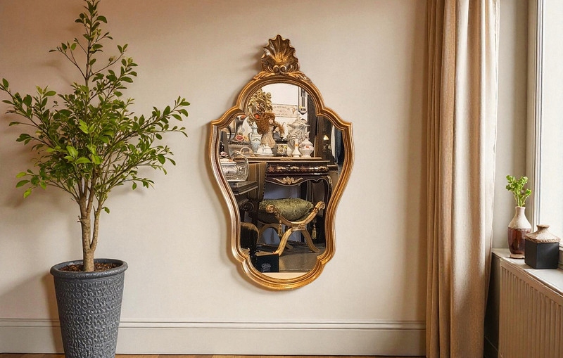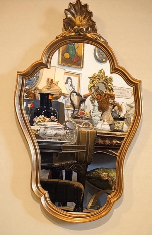 Красивое и впечатляющее зеркало в фантастической раме. Рамка цвета старого золота. Он восхищает своей изысканностью и оригинальностью. Состояние хорошее; небольшой недостаток – нежные царапины на зеркальной поверхности, которые были учтены при оценке.
