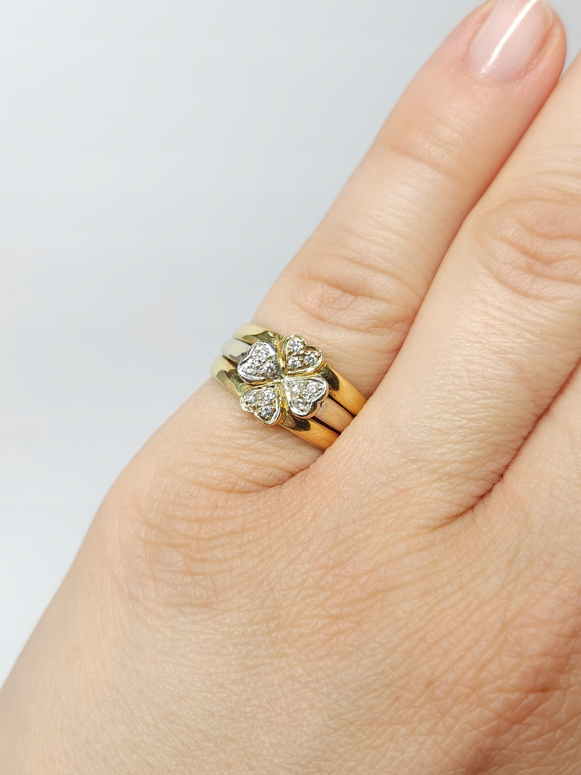 кольцо - обручальное кольцо, сделанное из желтого и белого золота, с декоративным элементом в форме четырехлистного клевера, взорванного бриллиантами: 12 шт. с общей массой ~ 0,10 им; Из -за возраста небольшие микроарины на кольце