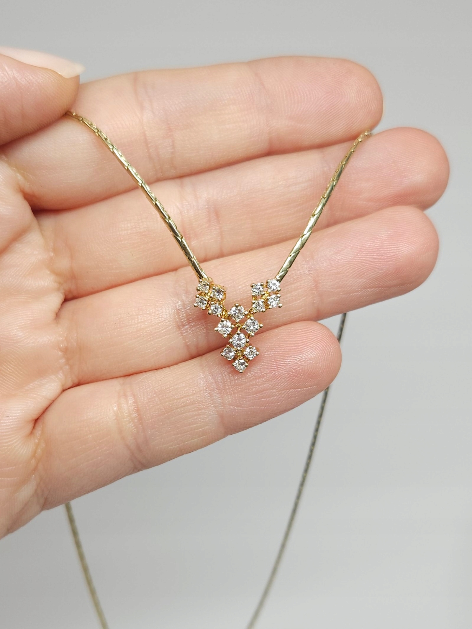 Нежное золотое колье с декоративным элементом, усыпанным бриллиантами классической огранки: 15 штук общим весом ~0,55 карата; колье имеет выдвижную застежку с дополнительной надежностью