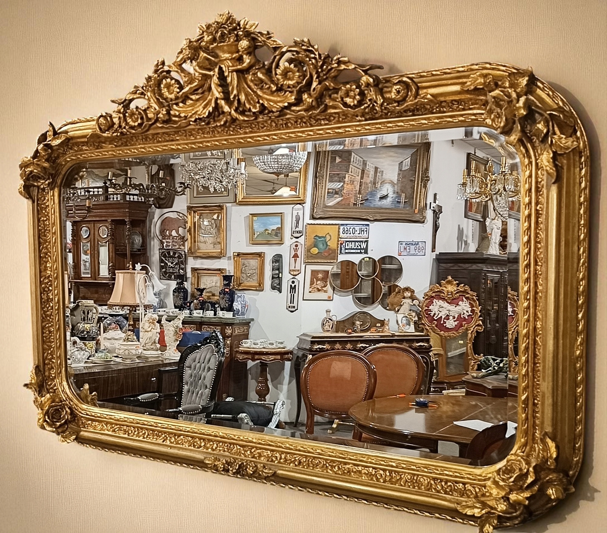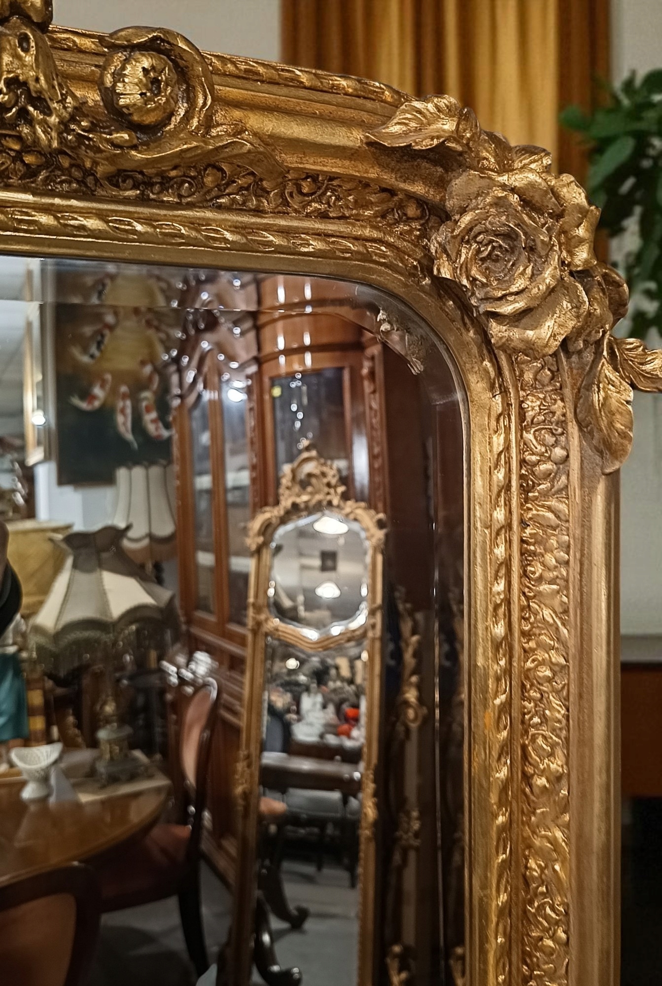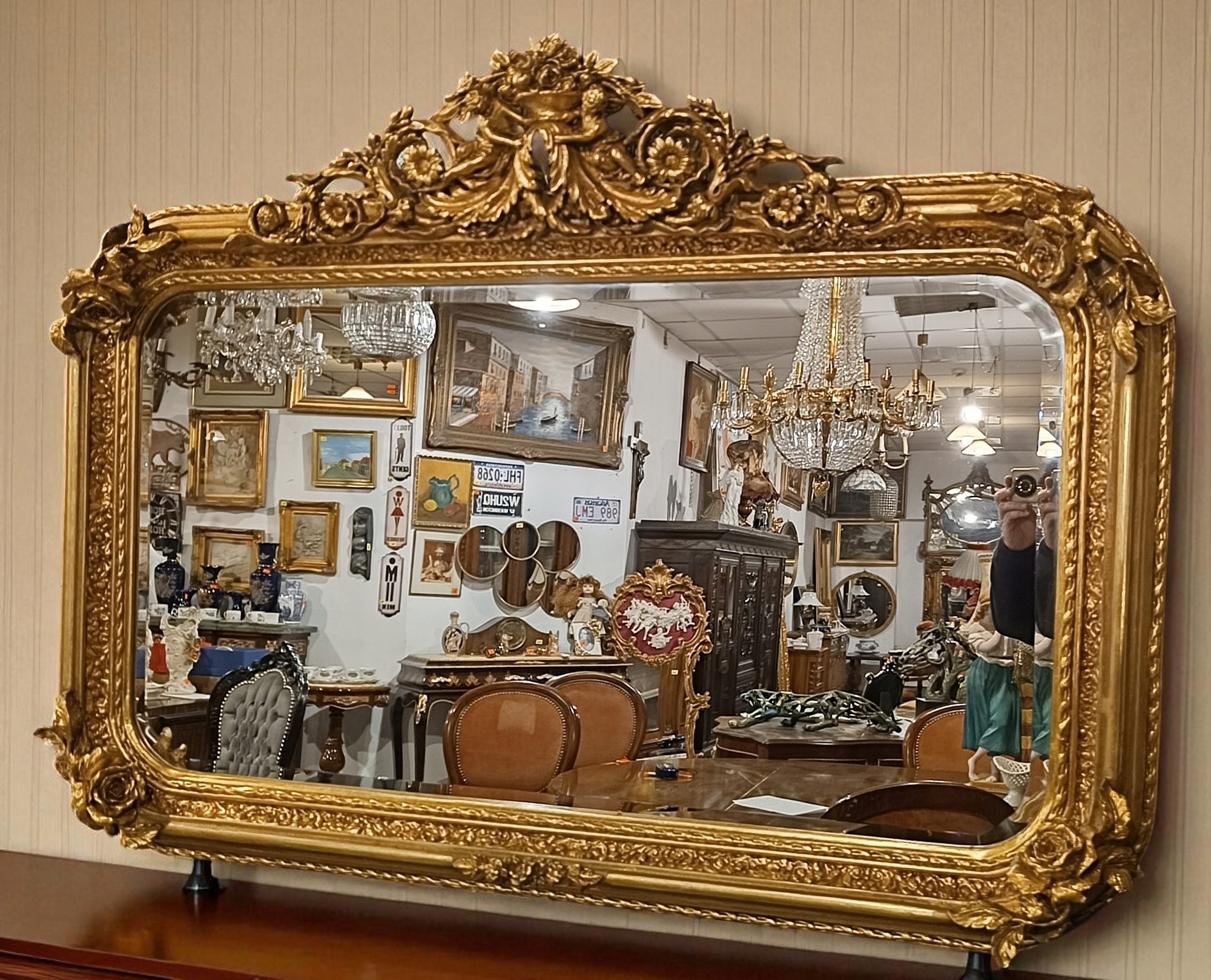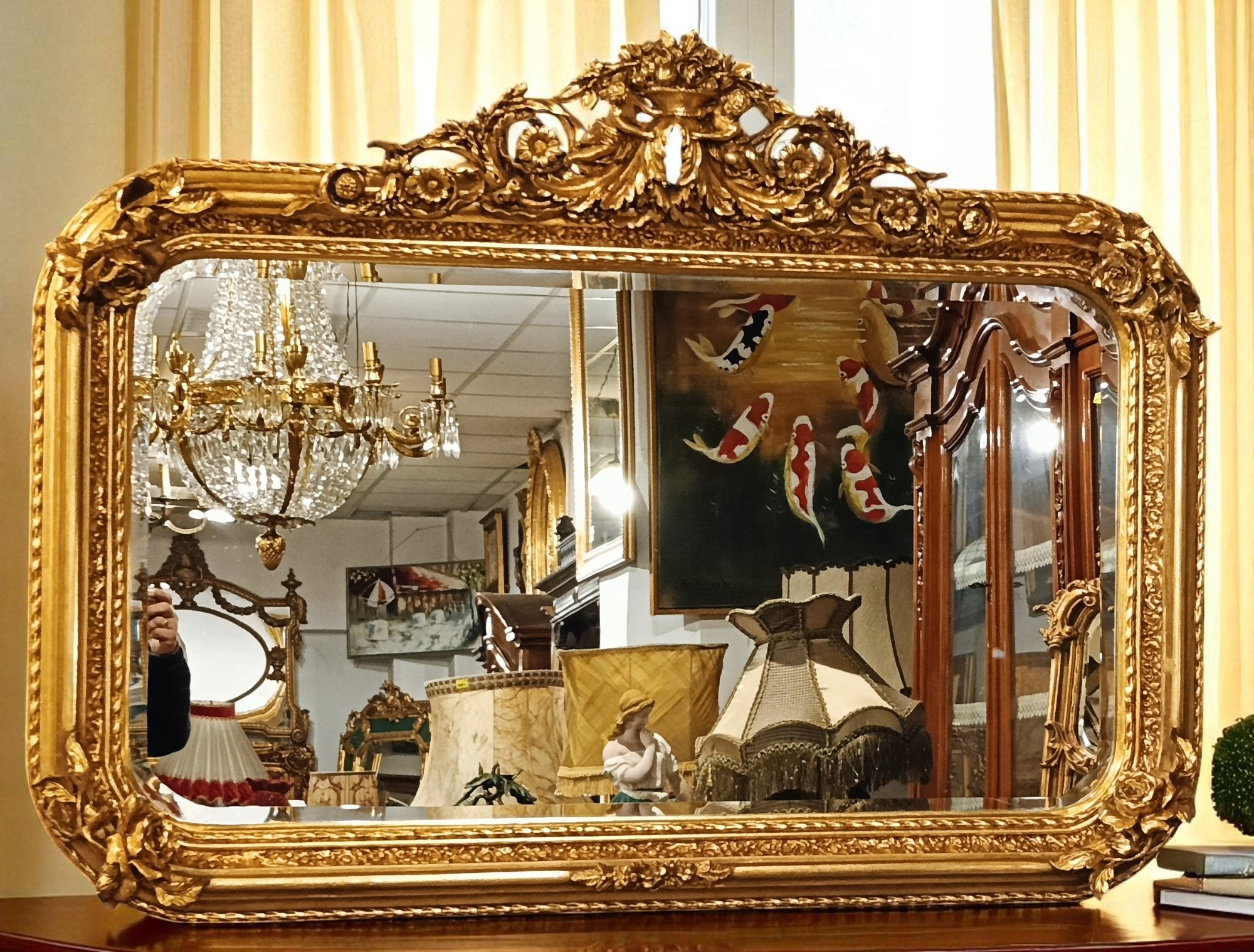 Барочное зеркало h1> Стильное зеркало - тремо с прекрасной кульминацией в верхней части. Зеркальная рама из дерева + декора; Отделка штукатурки в старом золотом цвете, ручное стекло. Зеркало очень привлекательное и декоративное. Это, безусловно, будет украшением вашего дома ......... Вот почему я очень рекомендую - очень хорошее состояние !!!