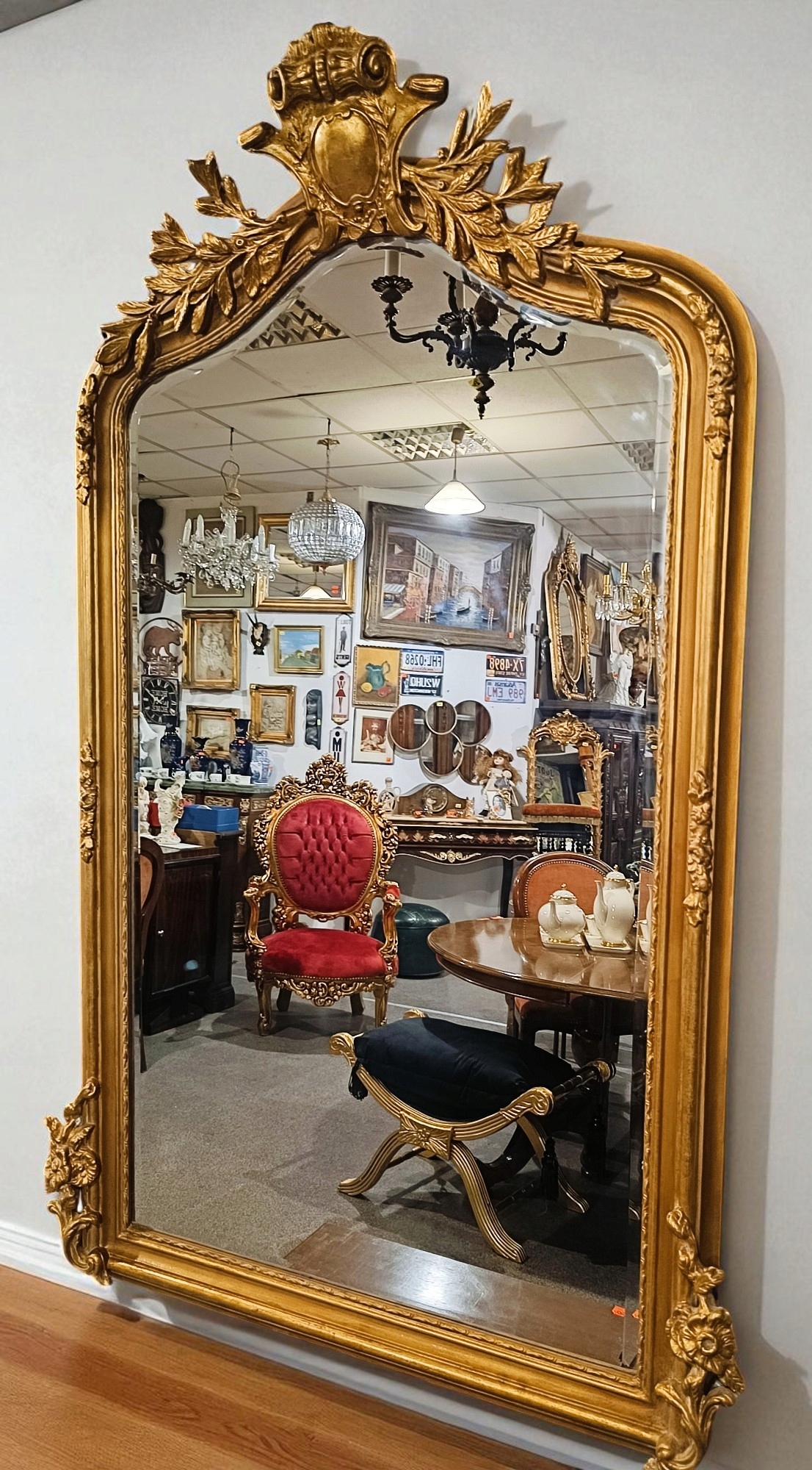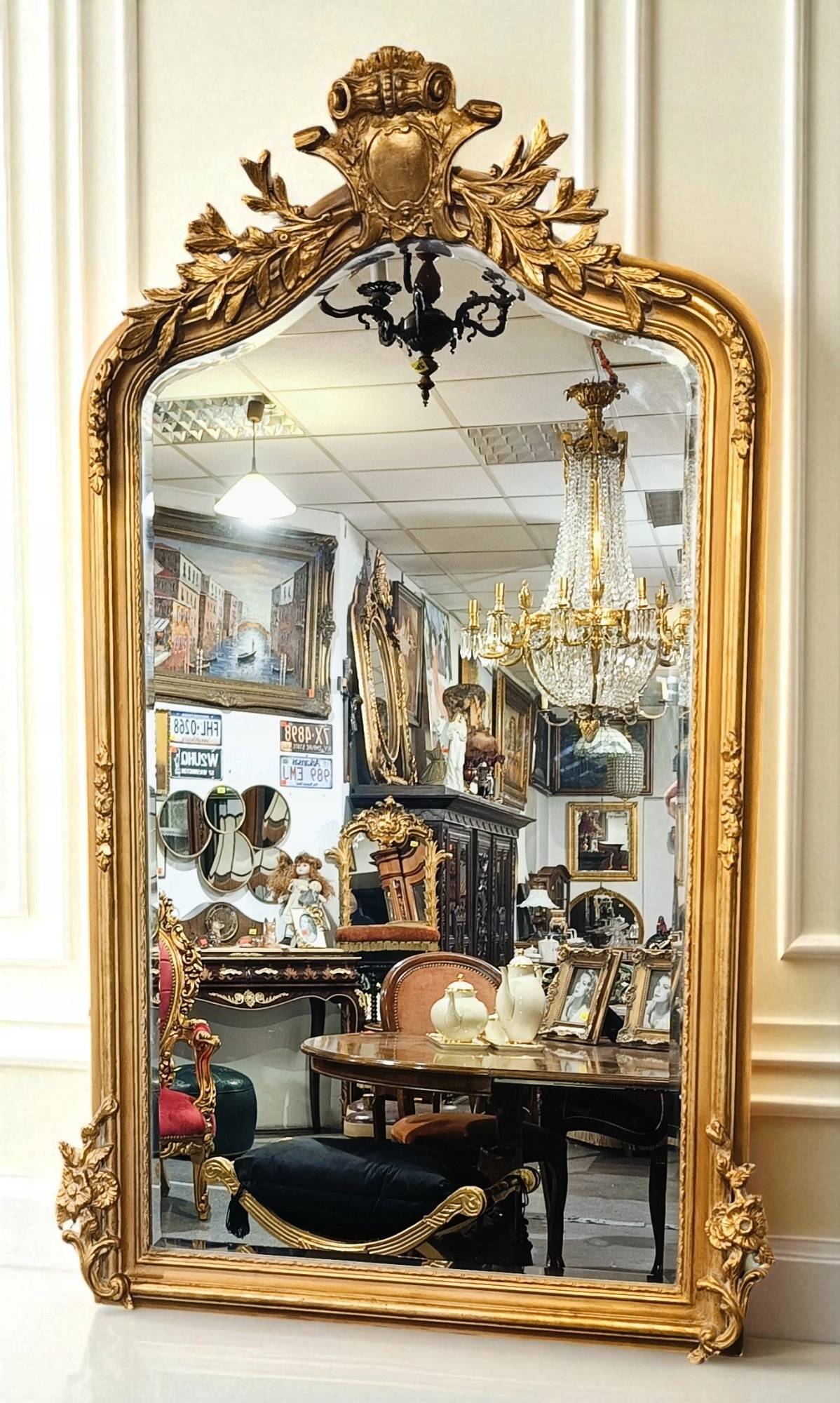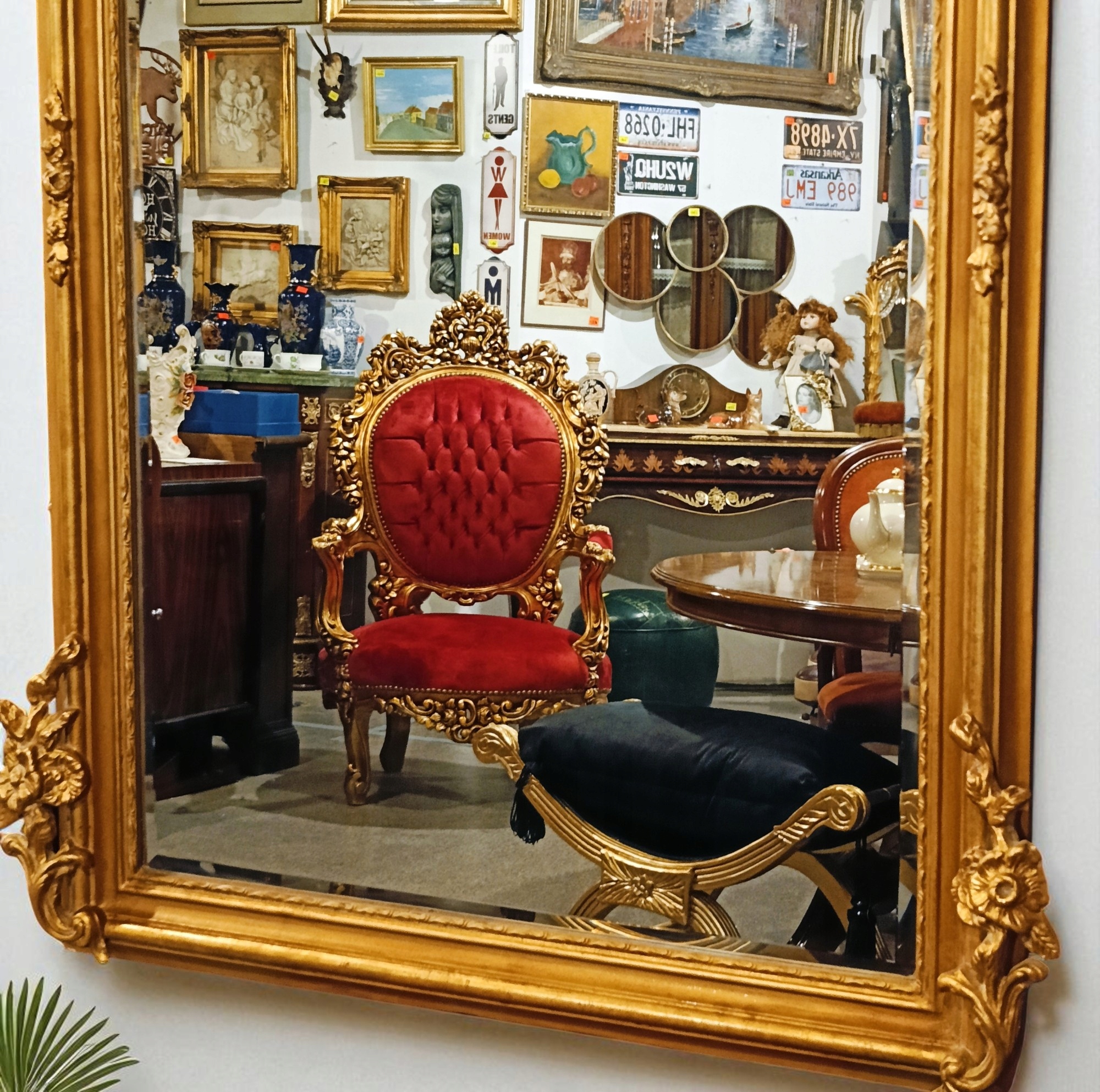 Барочное зеркало h1> Стильное зеркало с прекрасной короной в верхней части. Зеркальная рама из дерева + декора; Отделка штукатурки в старом золотом цвете, ручное стекло. Зеркало очень привлекательное и декоративное. Это, безусловно, будет украшением вашего дома ......... Вот почему я очень рекомендую - очень хорошее состояние !!!