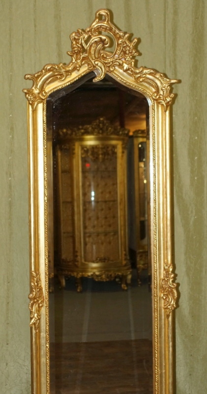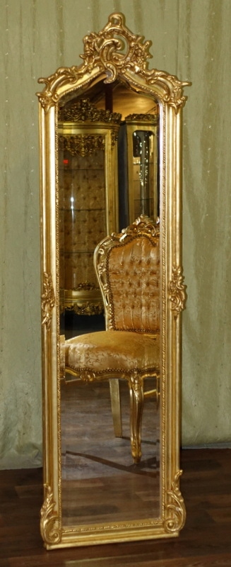 Красивое тонкое дворцовое зеркало. Каркас из дерева; украшен чувственной скульптурой по всей поверхности. Хрустальное стекло с изящной фаской. Все выполнено в цвете старого золота.