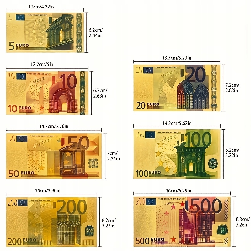 - Комплектация: Вы получите 7 копий банкнот: 5€, 10€, 20€, 50€, 100€, 200€, 500€.