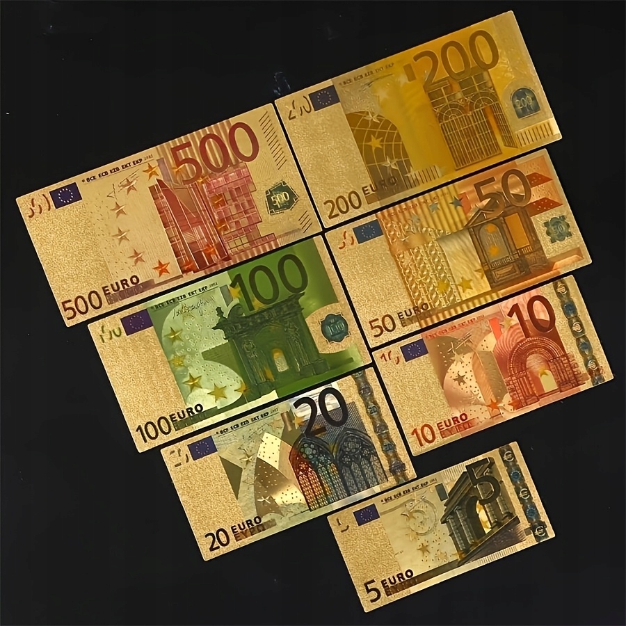 Мы представляем уникальный набор из 7 золотых копий банкнот евро, включая все номиналы от 5 до 500 евро. Эти высококачественные позолоченные имитации станут прекрасным дополнением любой нумизматической коллекции или оригинальным декоративным элементом. Это также отличная идея для уникального подарка!
