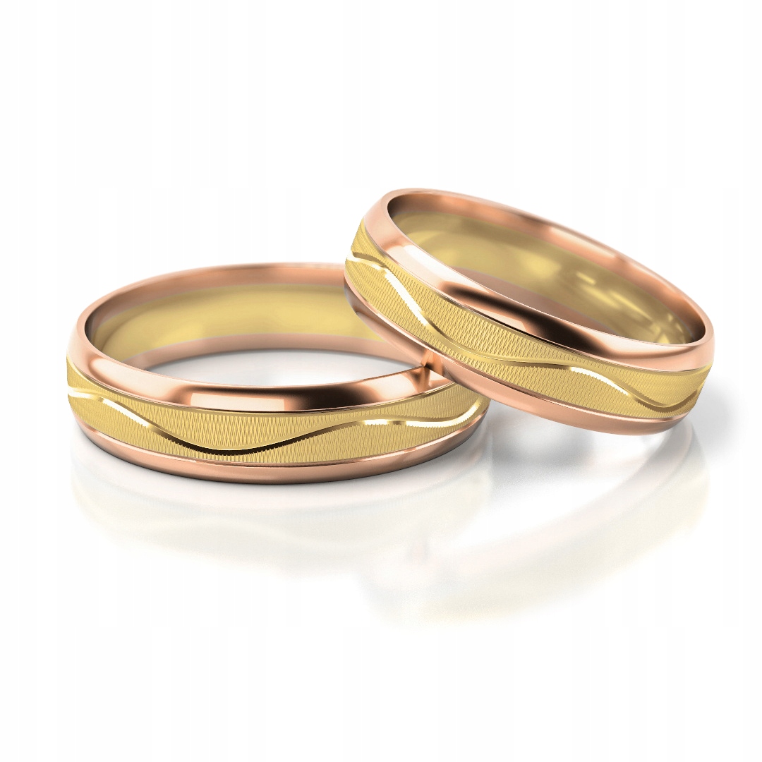 Обручальные кольца слегка закругленного профиля. Обручальные кольца украшены волнообразным разрезом по окружности.