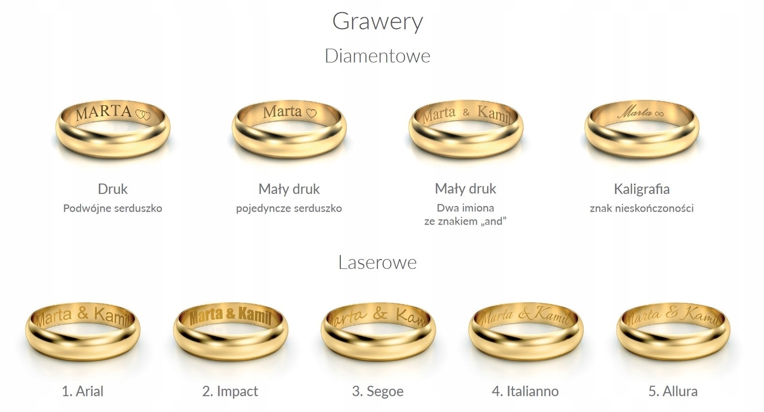 Гравировка: бесплатно на сайте по требованию заказчика в виде каллиграфического, мелкого и печатного шрифта. Кроме того, мы можем выгравировать одиночное сердце, двойное сердце, знак & и знак бесконечности.