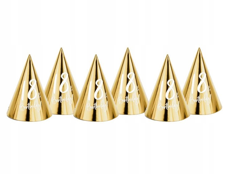 Шляпки из золотой металлизированной бумаги с белой надписью 18th Birthday!.