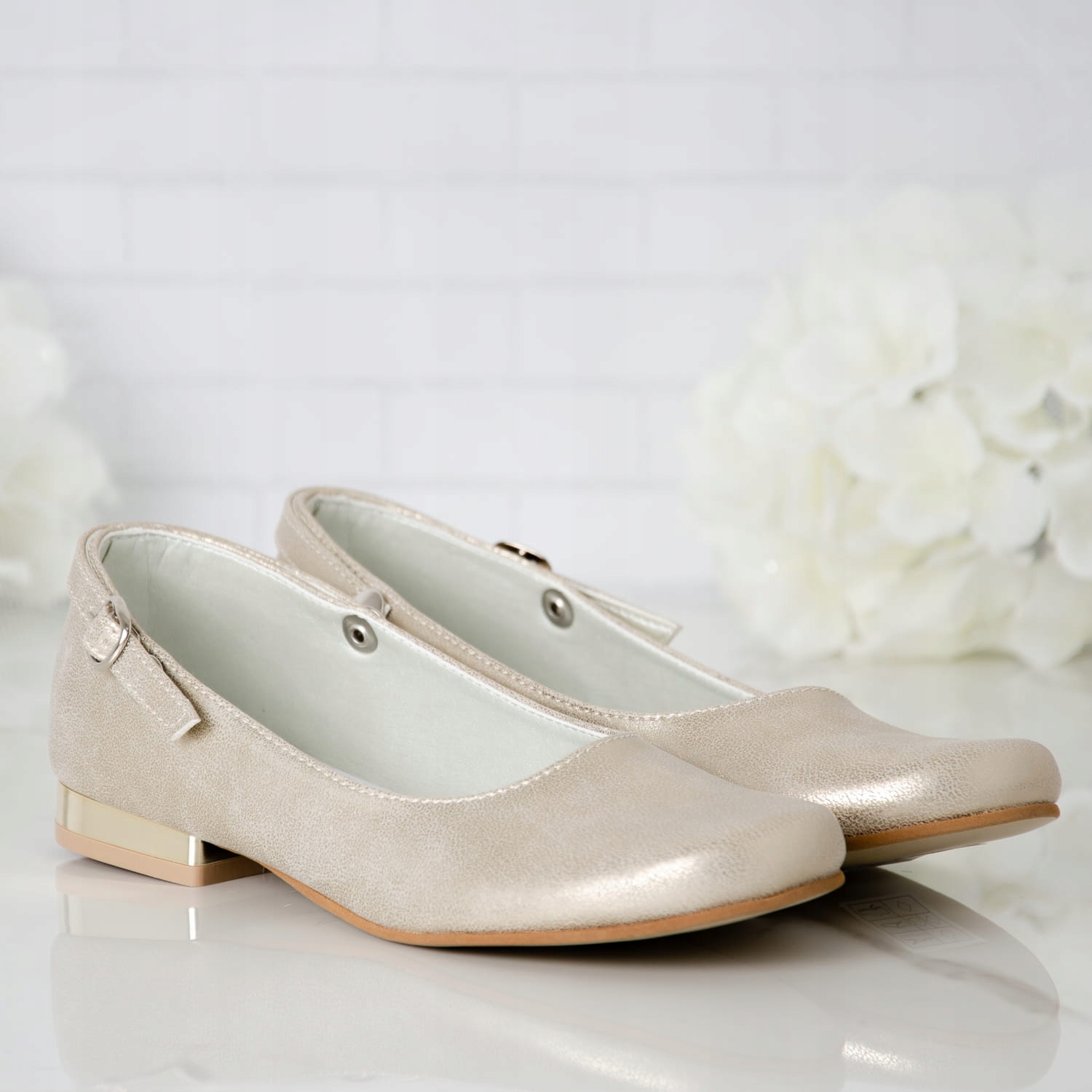 Элегантные формальные туфли золотого цвета без шнуровки для девочек. Ботинки имеют правильную форму, поэтому надежно сидят на ноге. Кроме того, у них есть ремешок, который можно использовать спереди для лучшей поддержки стопы или сзади в качестве украшения. Модель имеет изящный каблук высотой 1,5 см, золотистого цвета. Внешняя часть обуви изготовлена из экологической кожи, а стелька – из натуральной кожи. Классические балетки прекрасно подойдут как в качестве костюма для Первого Причастия, так и для других торжеств и не только.