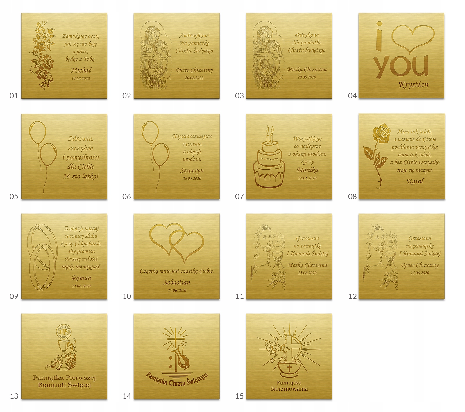Мы можем выбрать шаблон 1 из 12 случайных бляшек, а шрифт - посвящение и какую подпись. Ювелирные изделия с декоративным противеньом будут отправлены в элегантную кремовую коробку.