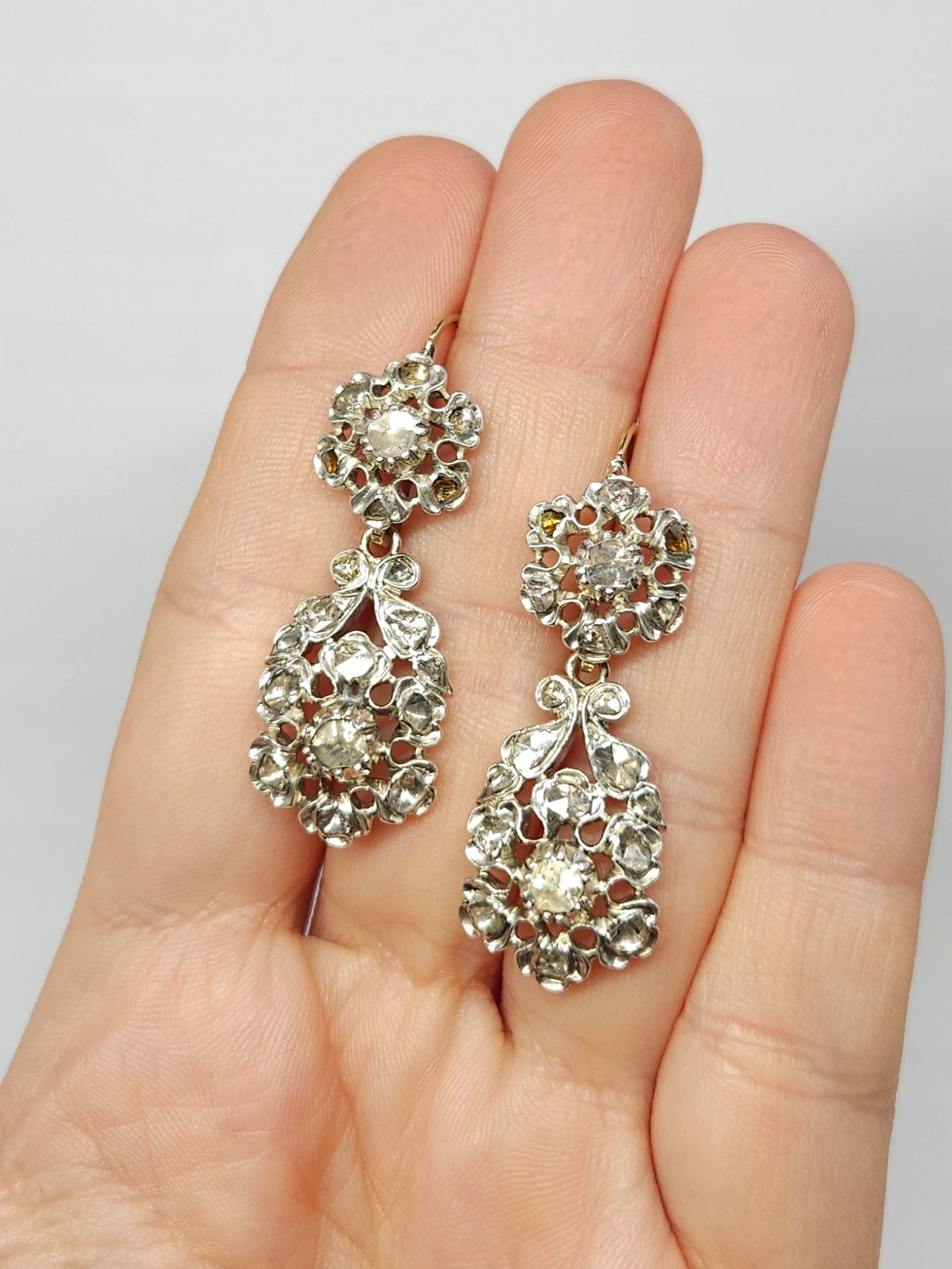 подвесные серьги с рутины 19 -го/20 -го века, надетые сзади и закрепленные спереди, изготовленные в золоте, взорванные бриллиантными розетками в серебряной раме: 40 шт. с общей массой ~ 1,40 дюйма; Серьги состоят из двух элементов, которые можно отключить