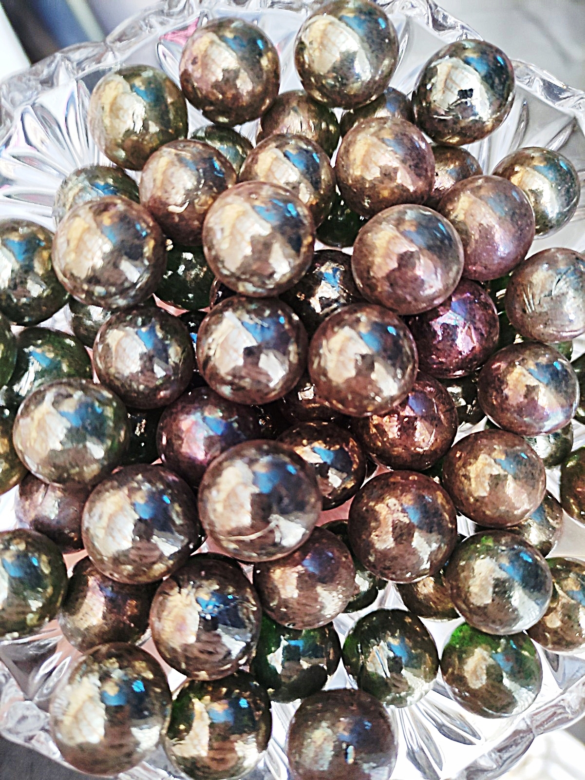 Стеклянные шары имеют интересный оттенок переливов, напоминающий старое зеркало античное золото.
