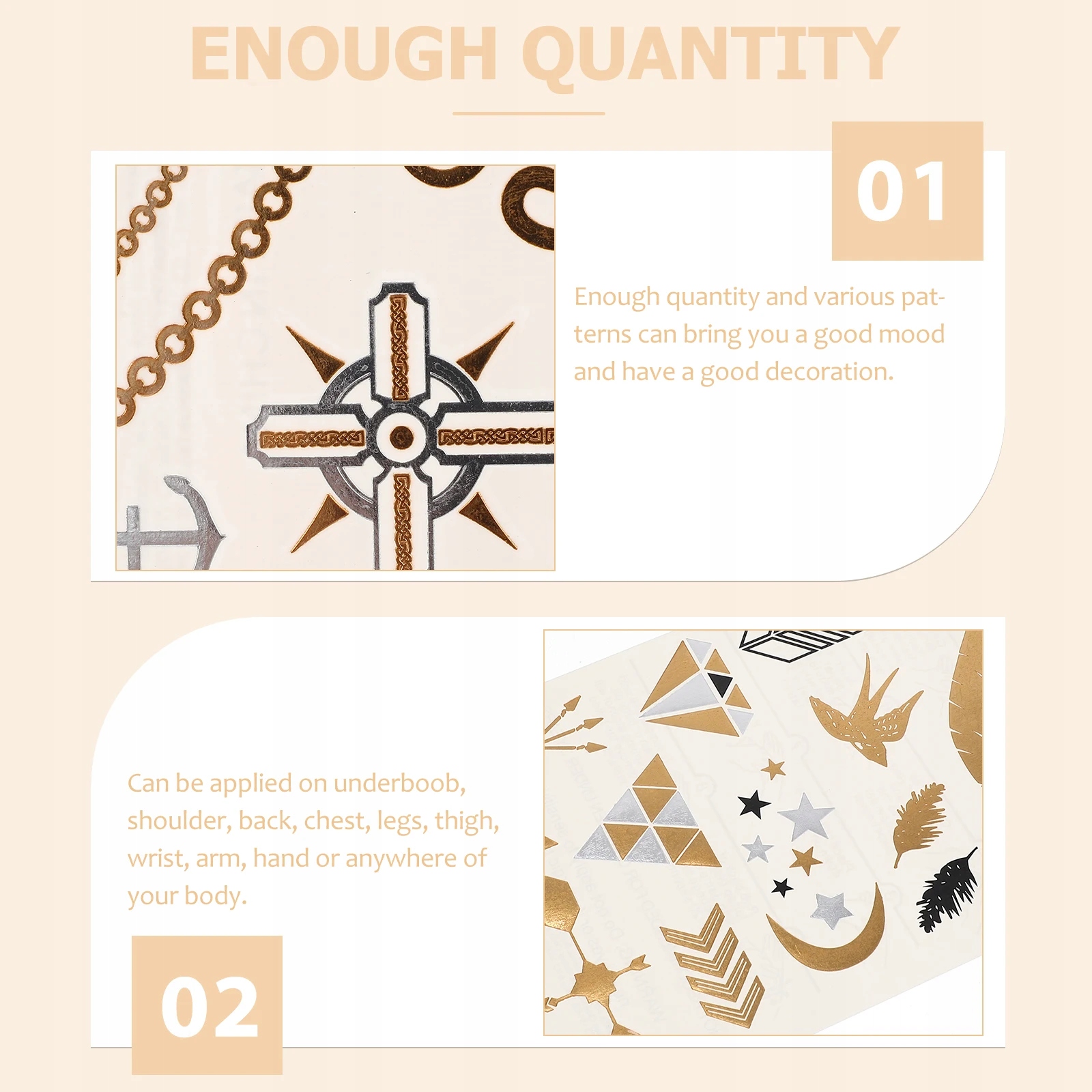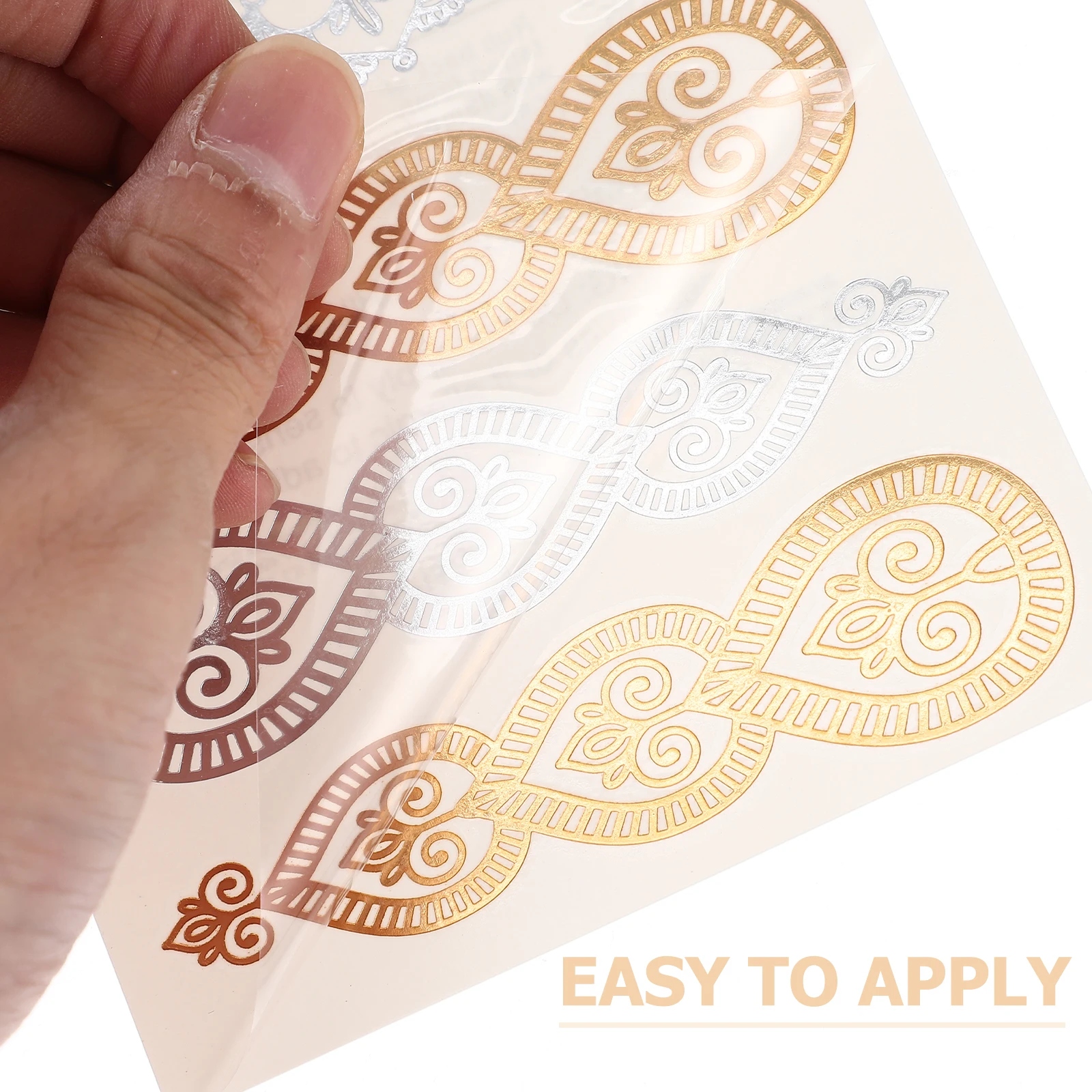 Эти металлические временные татуировки изготовлены из бумажного материала с водяной пленкой, они портативны, практичны и долговечны. Они подходят для поездки, фестиваля, выступления и т. д. Золотая временная татуировка-наклейка для украшения тела.
