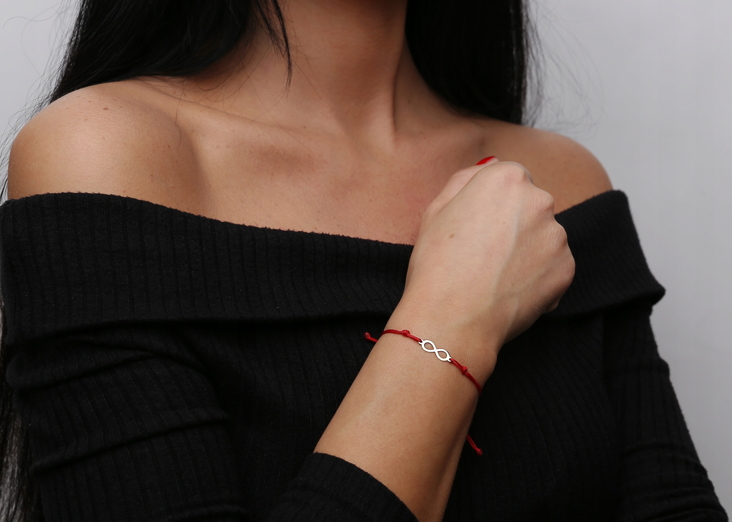 Браслет для девочки на красной нити со знаком бесконечности. Изготовлен из прочной нити и золота 585 пробы (14 карат). Потянув за веревочки, вы регулируете длину браслета, благодаря чему его можно подогнать под свое запястье. Тонкое и нежное, оно дополнит любой стиль