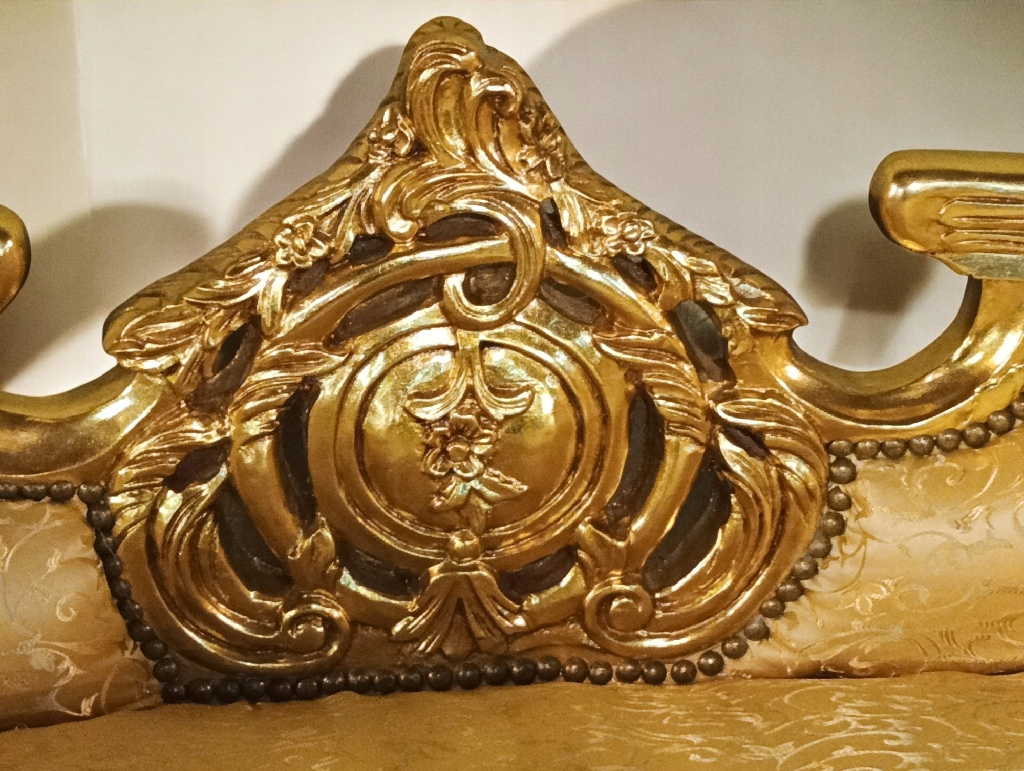 Palace Dofa h1> Золотая деревянная структура со вкусом скульптуры. Обивка из золота из деликатных растительных узоров, мерцающая в зависимости от угла падения света; Отделано со вкусом латунной сосны - очень хорошее состояние. h1>