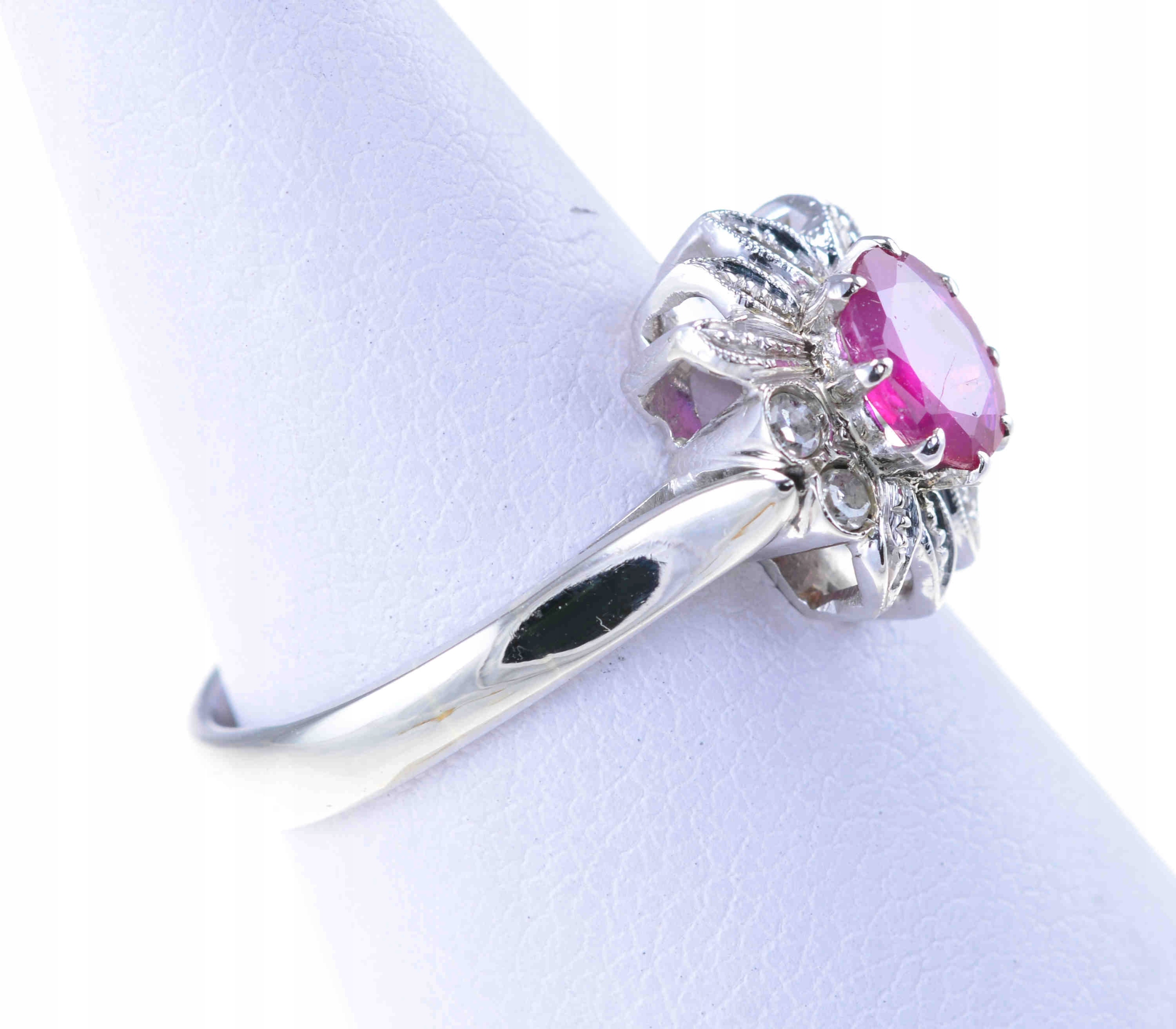 Предмет продажи выполнен из белого золота высшего качества. кольцо с рубином весом 0,62 карата и бриллиантами огранки 8/8 общим весом 0,12 карата.