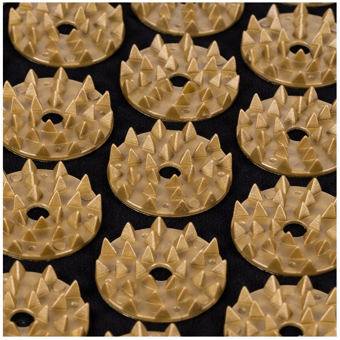 Шипы изготовлены из материала HIPS. Они характеризуются простой формой. Они острые, но с относительно тонкими кончиками, поэтому безопасны для вашей кожи. На одной розетке целых 27 шипов, а всего на коврике и подушке 13 743 точки давления. Давление шипов улучшает кровоснабжение всего организма и увеличивает лимфоток. Поэтому не беспокойтесь о покраснении кожи и ямочках после использования, ведь это естественная реакция организма.