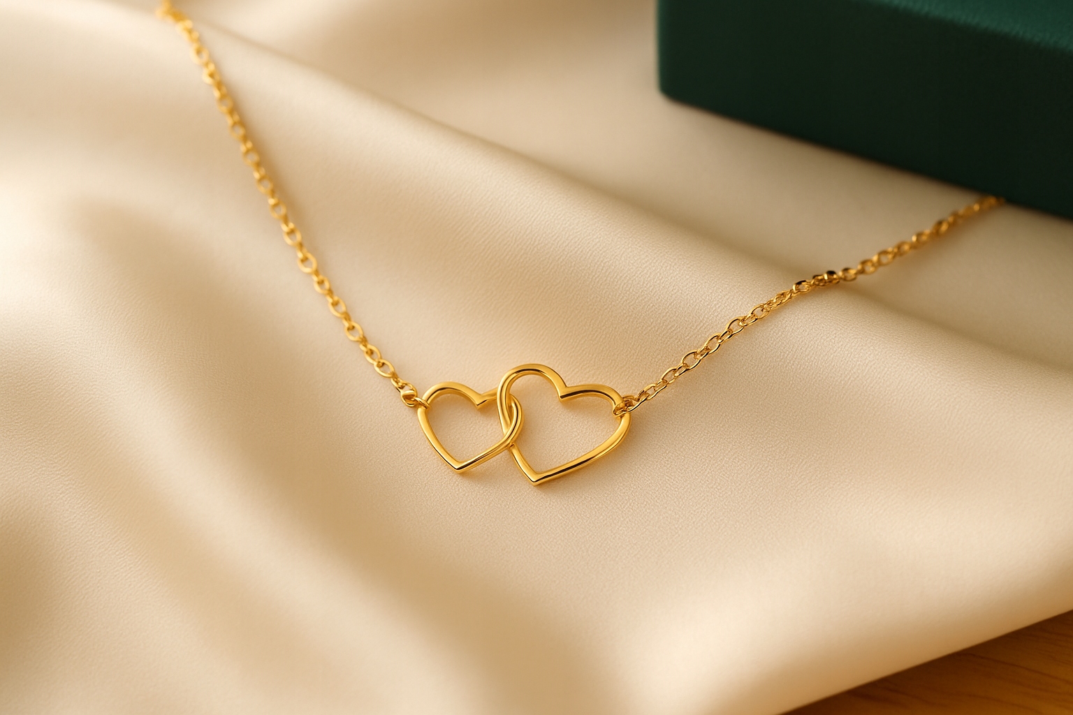 Позолоченная цепочка из хирургической стали с покрытием из 18-каратного золота - два сердечка, символ любви и близости