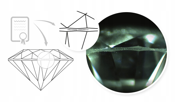 Романт с надписью имеет выжженный лазером номер сертификата и логотип сертифицирующей компании. Это еще больше упрощает идентификацию. С помощью лупы с большим увеличением или микроскопа мы можем прочитать номер, присвоенный тому или иному камню в сертификате. Обратите внимание, что сгоревший номер сертификата не гарантирует высокое качество бриллианта. Самое главное – подробные параметры бриллианта и надежная сертифицирующая лаборатория. Технология лазерного выжигания надписей широко доступна, а по специальному заказу на оправе бриллианта можно выгравировать любое содержимое.